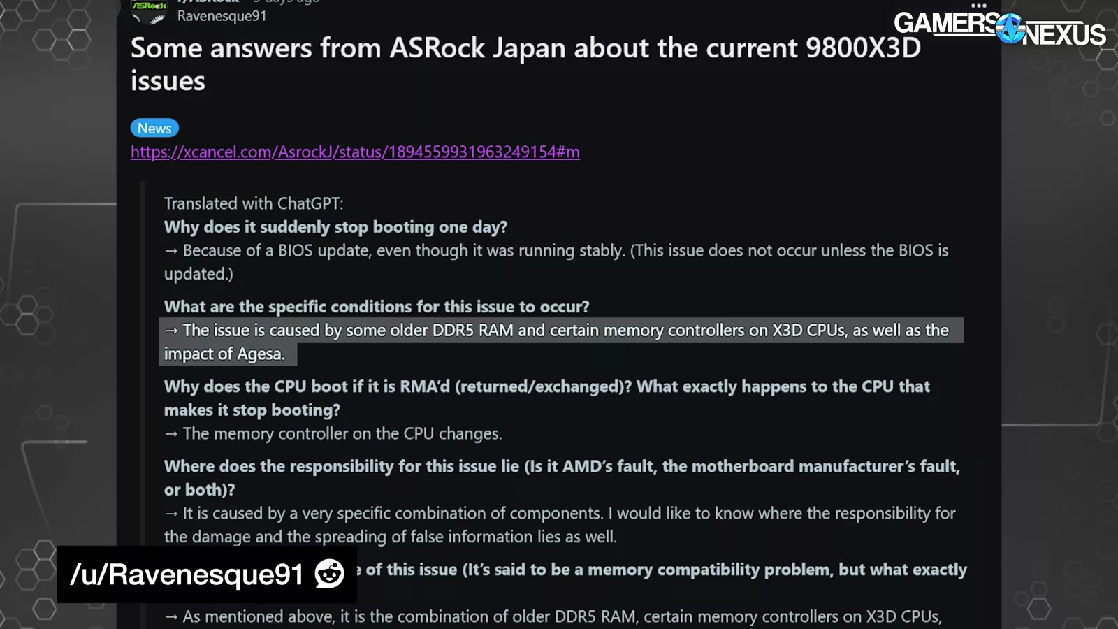 "The issue is caused by some older DDR5 RAM and certain memory controllers on X3D CPUs, as well as the impact of Agesa.”