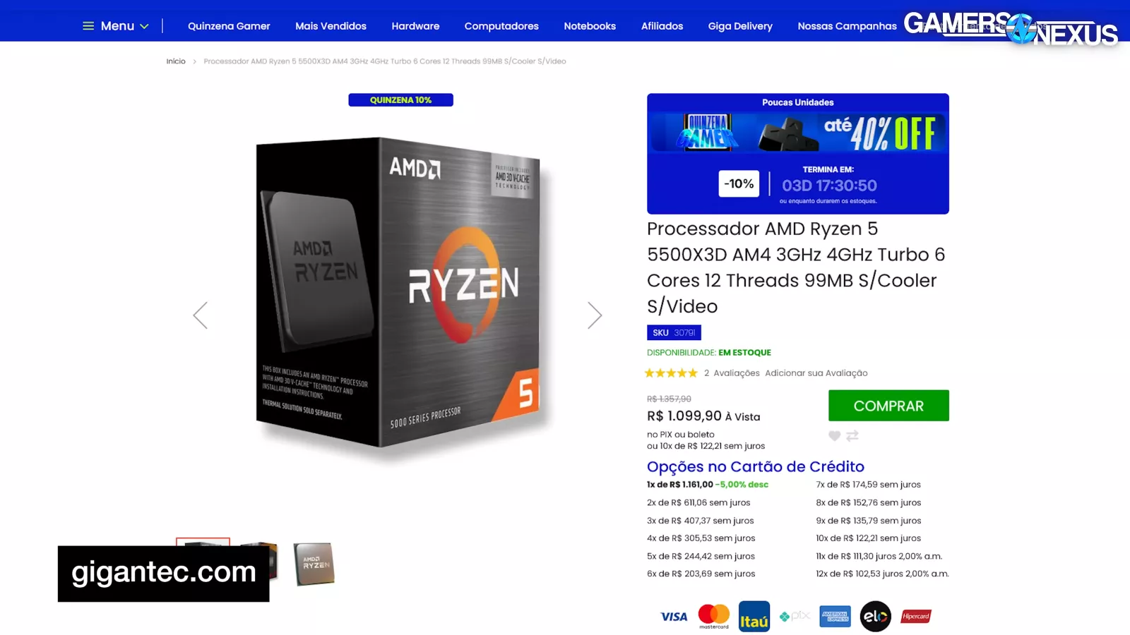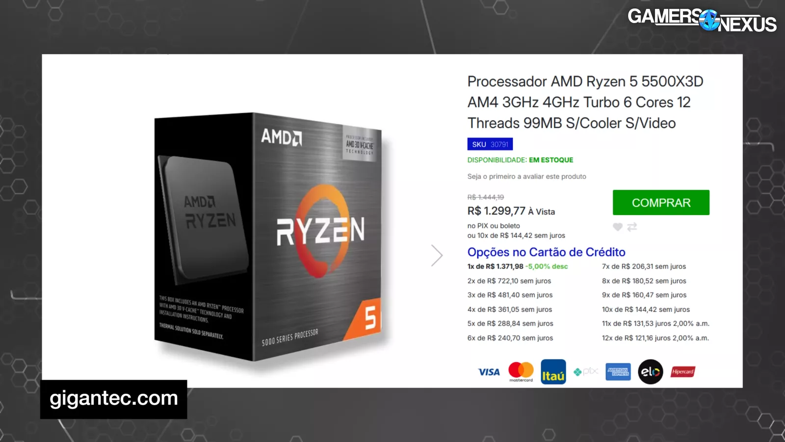 AMD launched the R7 5700X3D (read our review) in 2024 and the R5 5600X3D (exclusive to Micro Center) in 2023. The R5 5500X3D has a lower frequency than the 5600X3D and is exclusive to Latin America. Our viewer Leo in Brazil helped us buy one to review, and it’s currently priced at about $204 converted to USD and launched at around $240-$250 USD a couple months ago.