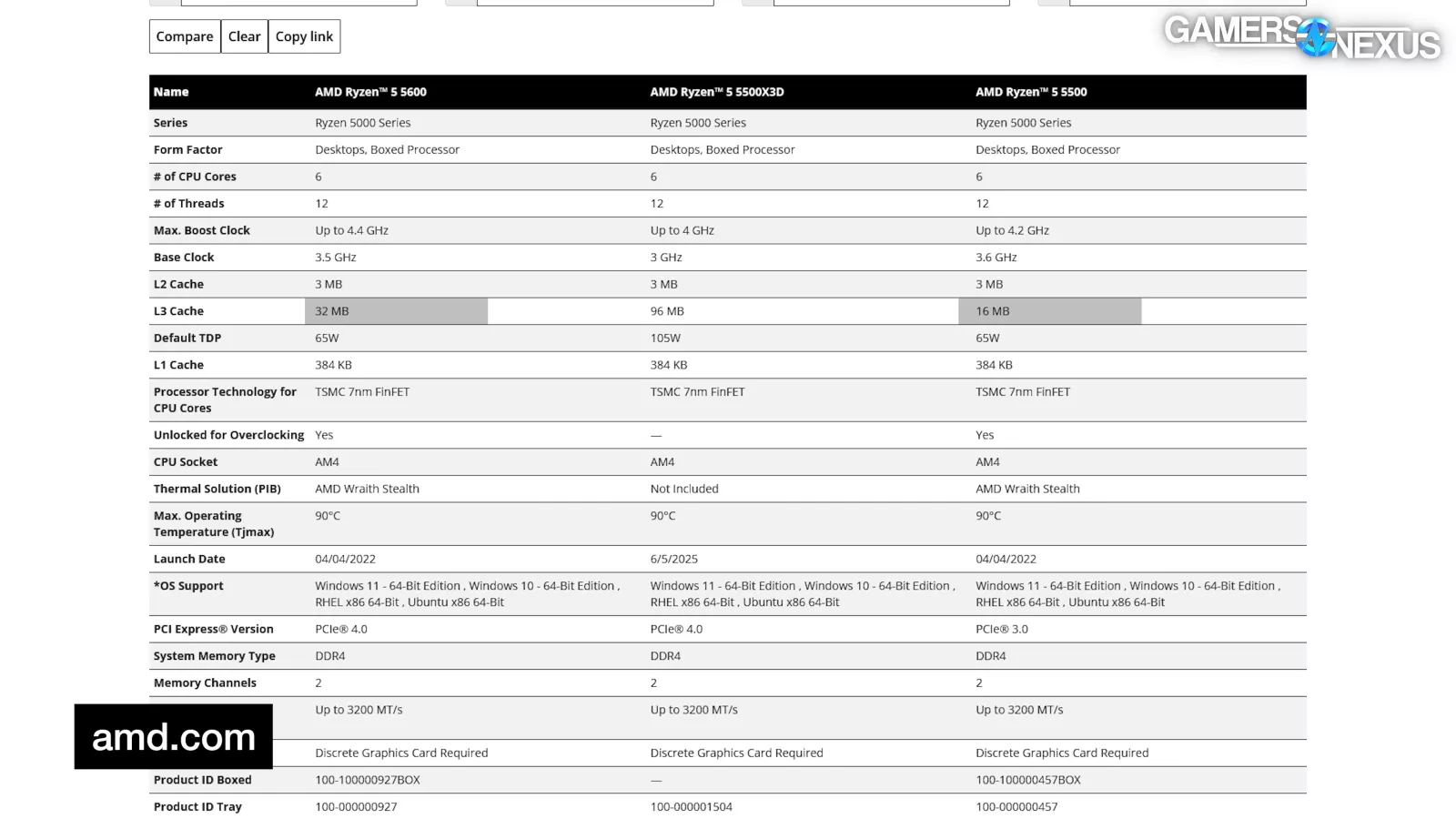The AMD R5 5500 non-X3D (watch our review) had a major downside from the R5 5600, which was the cache: The 5500 had just 16 MB of L3 Cache, down from 32 MB on the R5 5600. This was a huge change. Despite having the same core and thread count, same 65W TDP, and frequencies which are overall close enough to be comparable, this loss of cache materialized heavily in gaming performance right away in most cases.