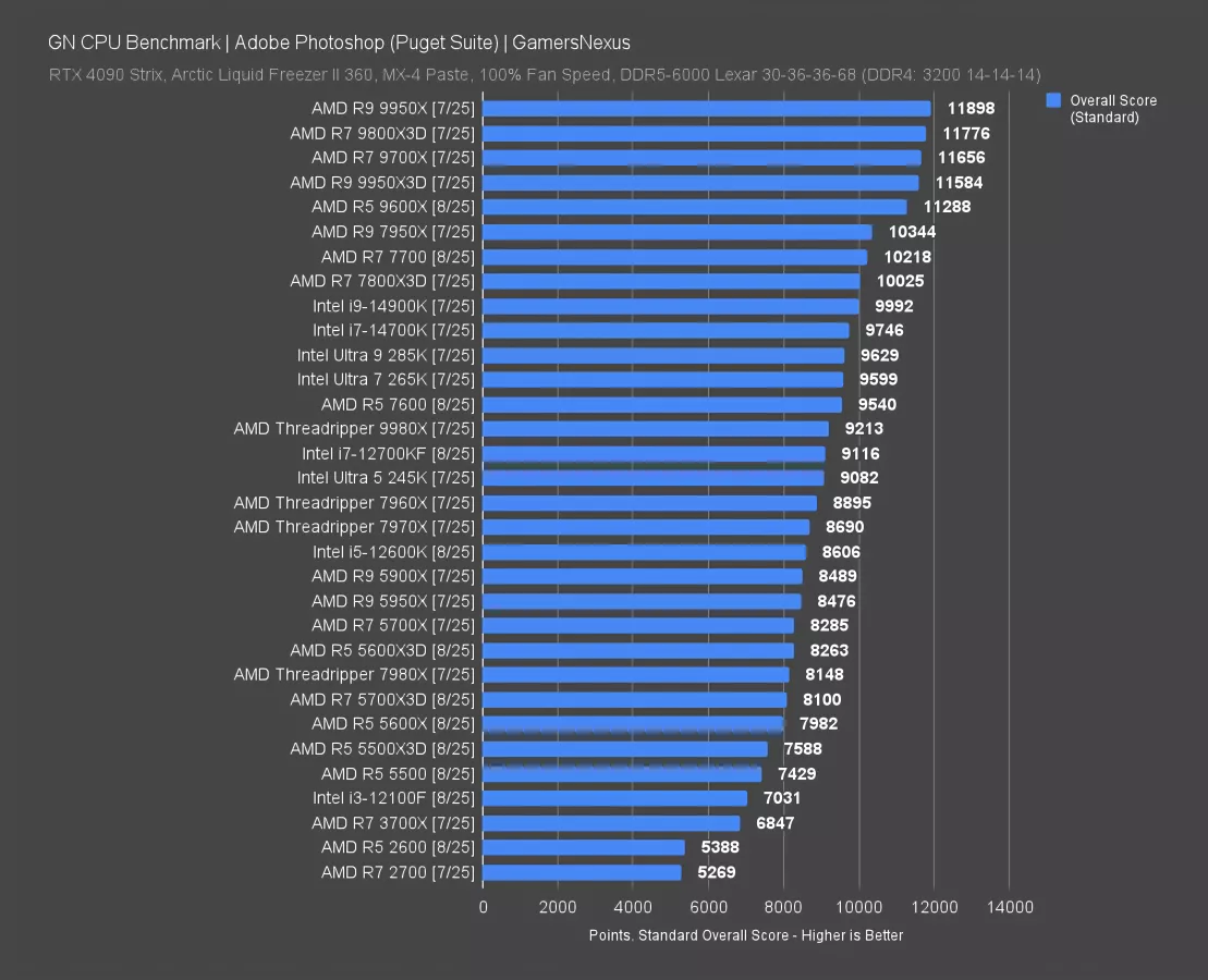 In Adobe Photoshop with the Puget suite, the 5500X3D lands again at the bottom of the chart. It’s ahead of the 5500 non-3D but behind almost everything else, including the gaming neighbor 12600K.
