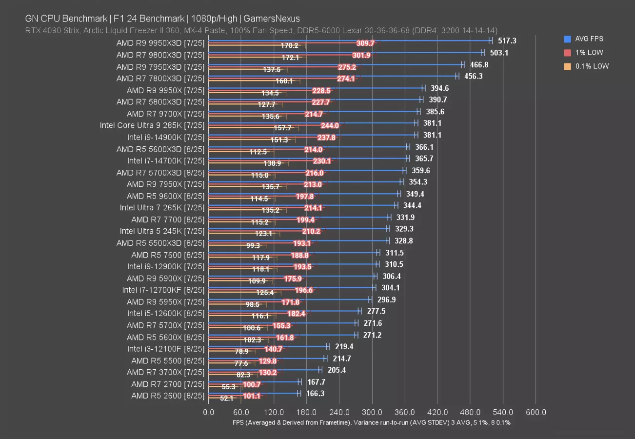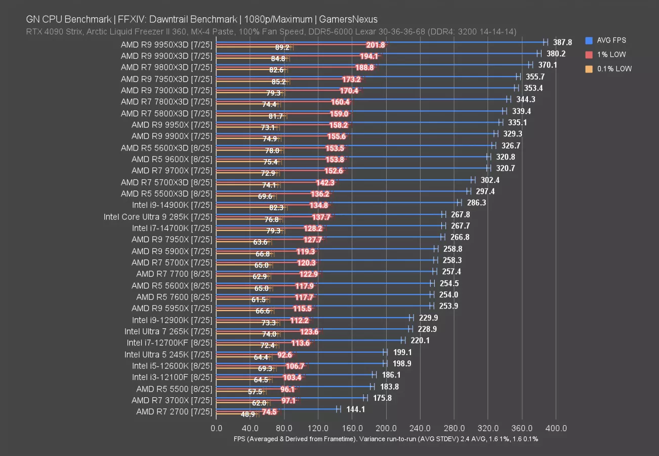 The 9800X3D helps establish a ceiling around 370 FPS AVG, with the 9950X3D pushing close to 400 FPS. There’s room to scale here.