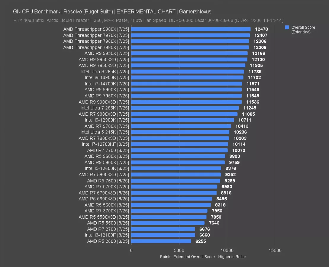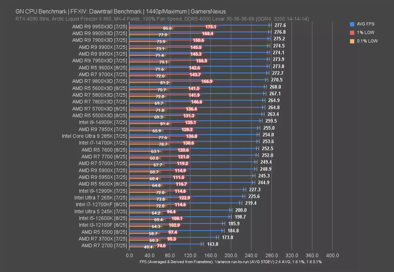 Baldur’s Gate 3 is up now. This one is lightweight on GPUs, but can be surprisingly good for showing CPU scaling. The 9950X3D (read our review), 9800X3D, and everything below them prove that. We’re still scaling all the way up to the best two CPUs on the market.