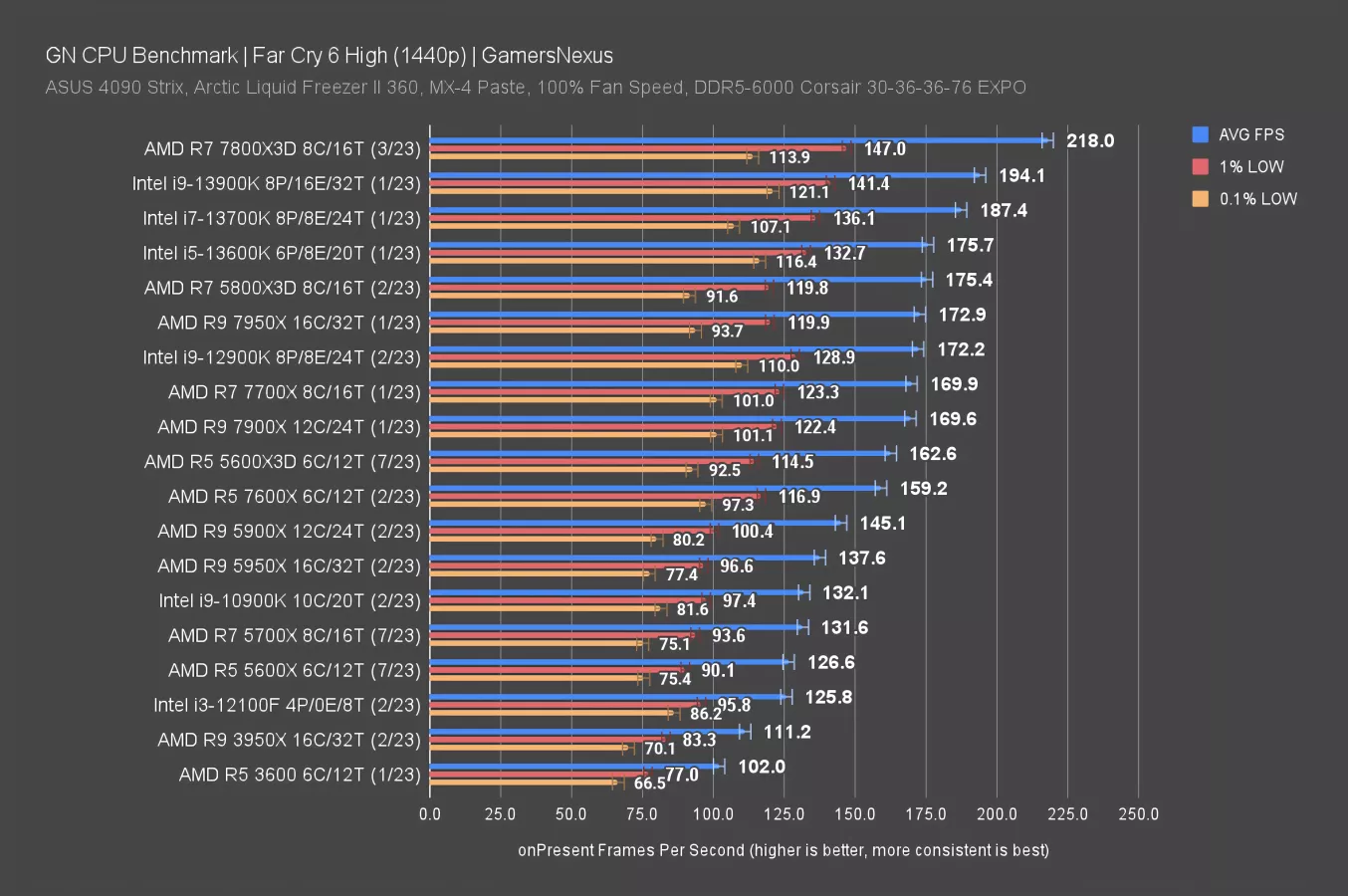 Like with Far Cry 6, there’s no change to the middle of the stack at 1440p. Actually, there’s basically no change other than some small movement: Even the 13900K remains about equal in performance. We’re fully CPU-bound.