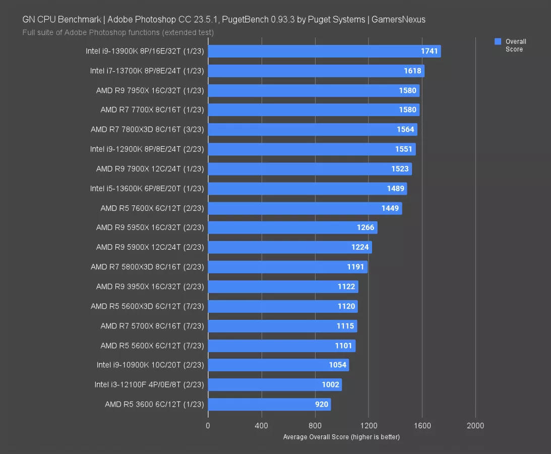 In Photoshop, the R5 5600X3D scored 1120 points in aggregate by using a similar approach to the Premiere test suite, both with Puget’s tools. That result has the 5600X3D technically ahead of the 5700X, but realistically, they’re the same. The lead over the 5600 is outside of error and is about 1.7%, but nothing meaningful. That’s consistent with the other workstation tests. Intel’s more expensive 13600K is significantly ahead at 1489 points, or a 33% lead. The 5800X3D is ahead of the 5600X3D as well, establishing the core advantage.