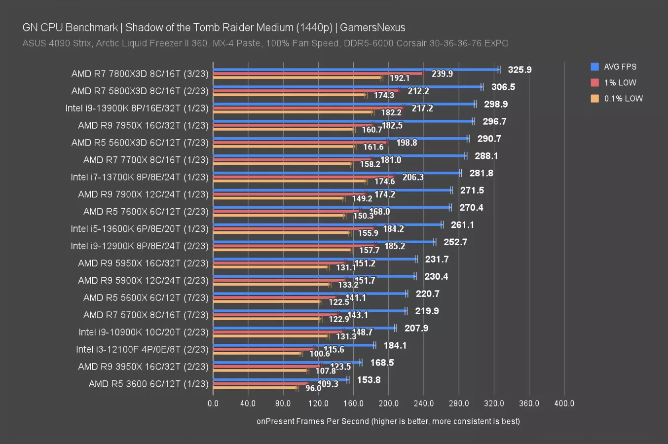 We’re going to start with the two games where we saw the most uplift in previous X3D tests. Tomb Raider is up first, another game where we’ve seen massive uplift from 3D V-Cache CPUs.