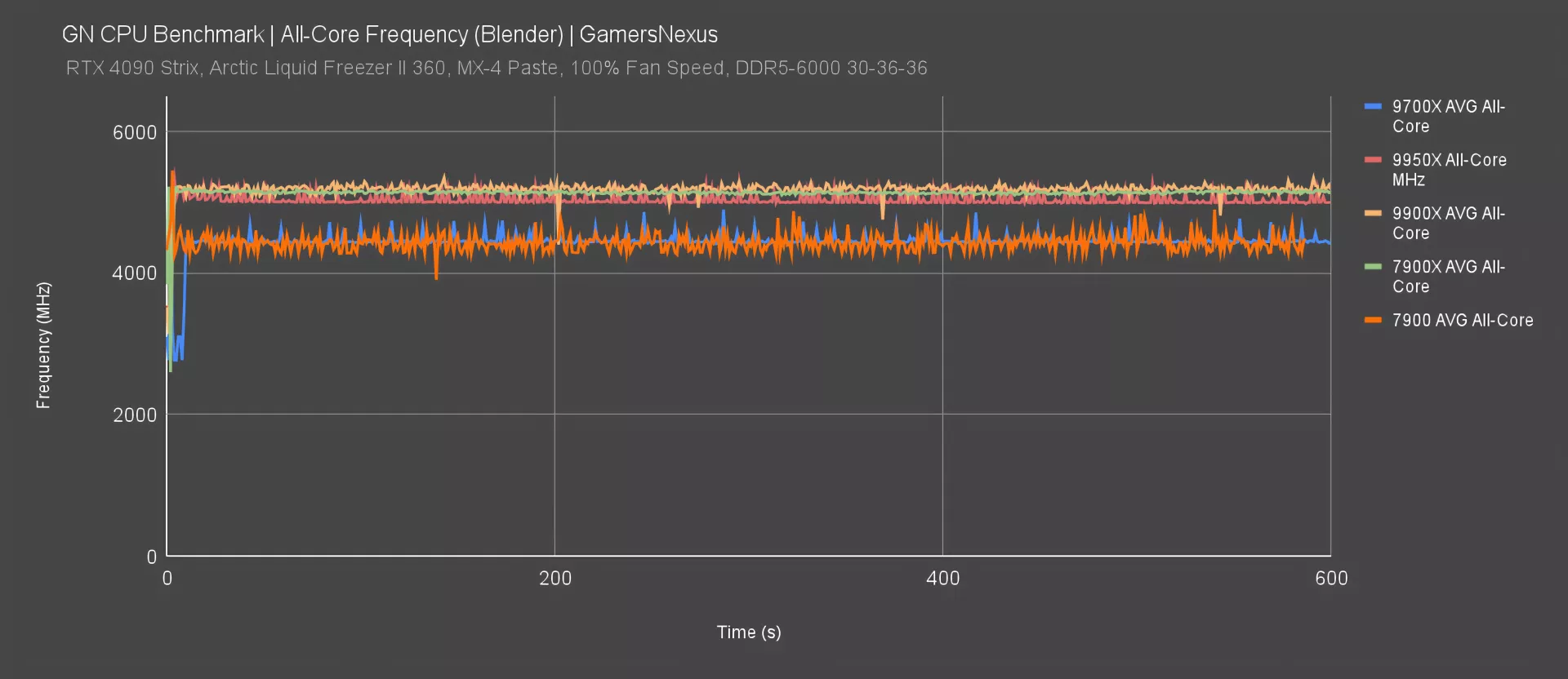 All-core frequency starts us off to validate that the CPU is performing as expected. To first re-establish the other recent numbers: With all threads loaded rendering, the 9700X was averaging around 4440-4480MHz all-core, mostly limited by its power budget. The 9950X measured around 5000-5100MHz, commonly around 5000MHz. This was a big jump from the 9700X and is enabled by the higher power budget.