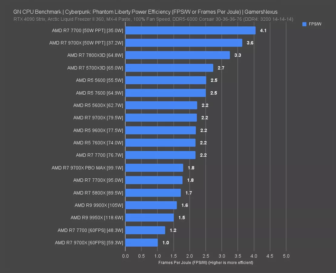 Phantom Liberty had the 9900X at about 105W during the test, which landed it at around 1.6FPS/W. That ranking has it functionally tied with the 9950X, which pulled 119W here, and the 5800X, which pulled 90W. The 9700X is a better balance for Zen 5, up at 2.2FPS/W. The 9700X is tied with the 7700 non-X and outperformed by the preceding R5 CPUs and the X3D CPUs.