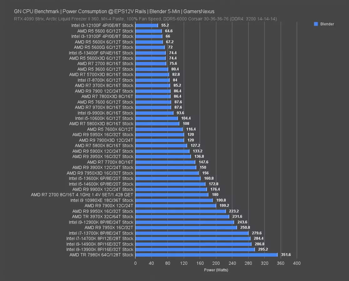 Also, just for fun, we threw Intel’s own 9900 on here -- except it’s the 9900K from 2018 (watch our review) and it pulled 94W. The company also had a 9900X, but it seemed extreme to buy a 6 year old CPU for one joke.
