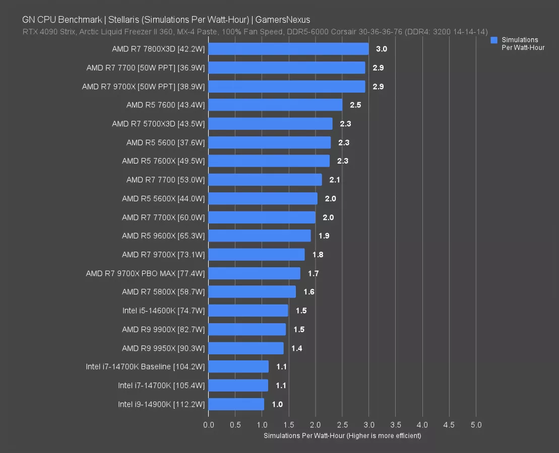 In Stellaris for simulation time, the 9900X ranked at 1.5 simulations per Watt-hour. Predictably, it is less efficient in gaming workloads than the 9600X at 1.9 Sims/Wh and the 9700X at 1.8 Sims/Wh. The 9900X pulls a little more power but isn’t intended to outrun the R5 and R7 CPUs in gaming, and so it’s ranked instead alongside the 9950X. This is expected behavior; the 9900X and 9950X are really only meant to be capable of gaming, not outperform AMD’s other CPUs.