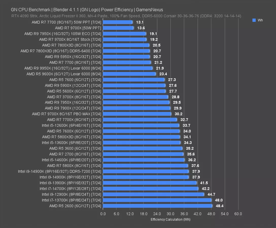 In Blender, the 9950X ends up neighbors with the 7700 and is less efficient than the old 5950X (watch our review), which was a remarkable chip for its era. The 7950X ranks at 29.5Wh here, so in the very least, the 9950X improves massively on that: Its improvement is a 26% reduction in Wh measurement for this specific test.