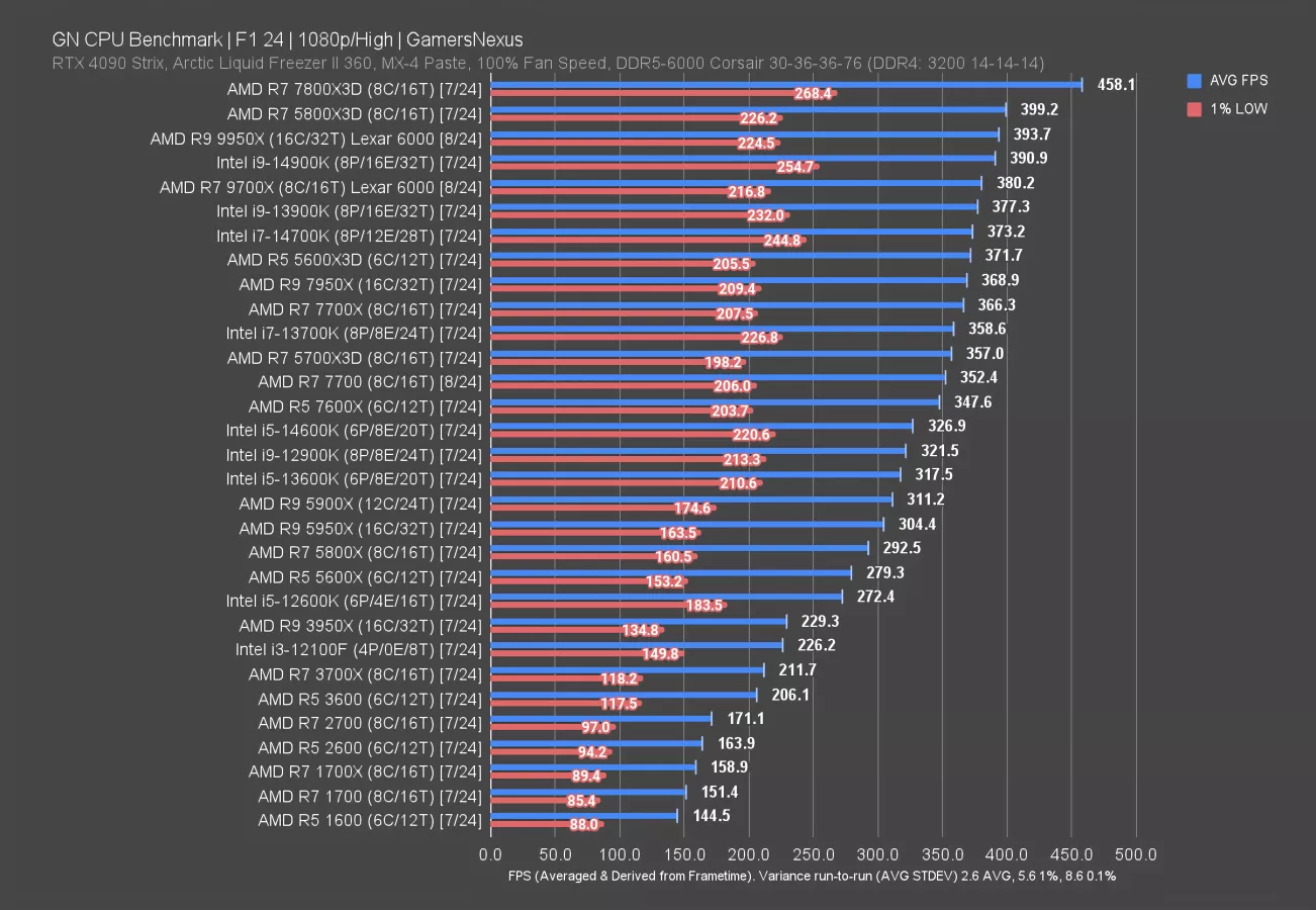 Now for F1 2024. F1 had the 9950X at 393.7 FPS AVG, with the 9700X at 380 FPS. That’s about a 3.5% difference between them. One note: We have observed more variable behavior in this test on the 9000 CPUs as compared to the 7000 series, which we think has to do with the change in memory kit that we’re using. As we discussed last time, we can’t use our standard Corsair DDR5-6000 kit for the 9000 series as the platform has some issues running it at the manual timings we set, despite 7000 working since launch. The Lexar kit does pretty well to match, but is not a precise match and has some reduced controls on some timings.