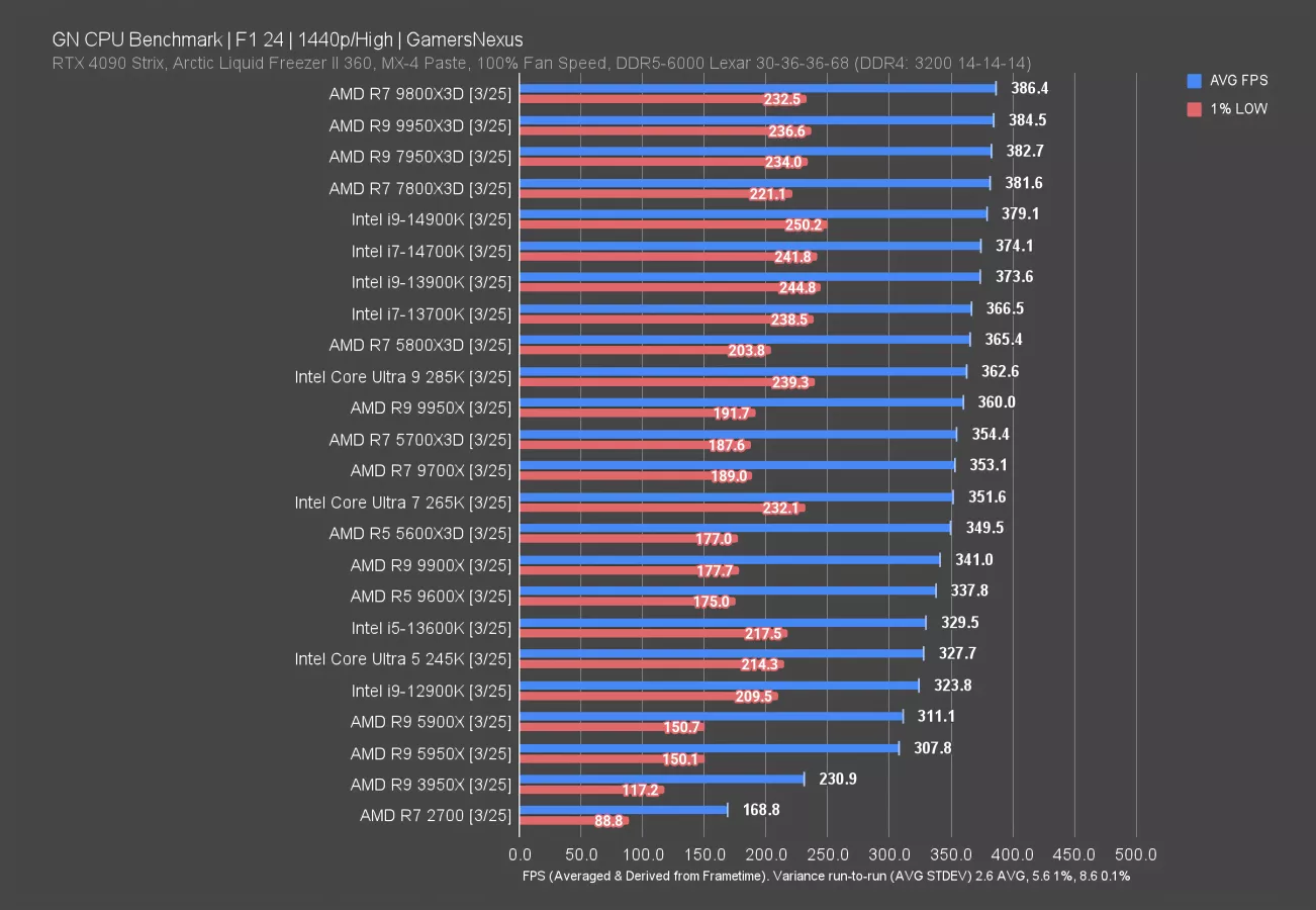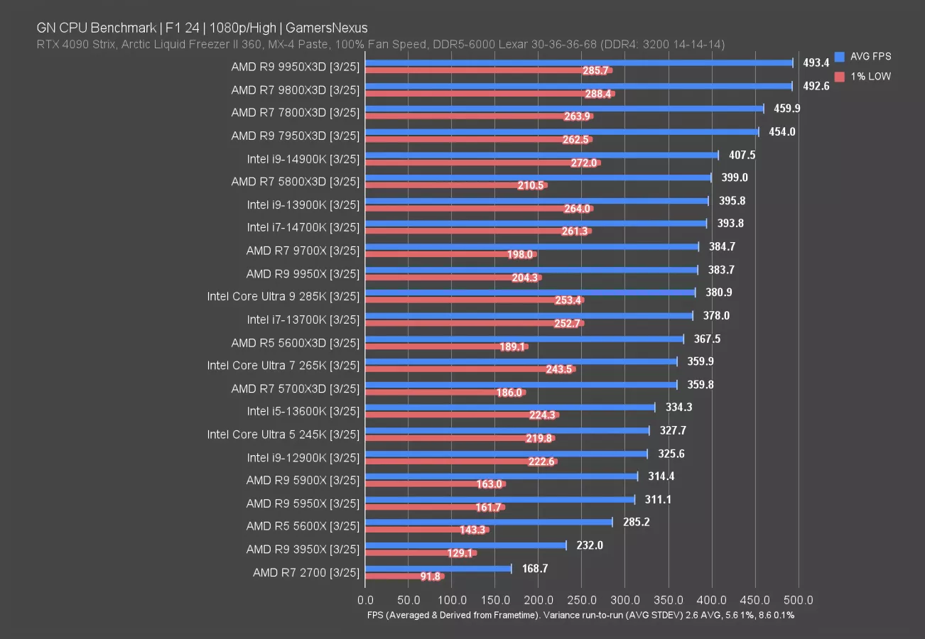 The 9950X3D bests its 9950X non-3D variant by 50 FPS or so, or 16% here in average framerate. The 1% lows are also significantly improved, indicating that frametime pacing is keeping up with improvements in the average framerate.
