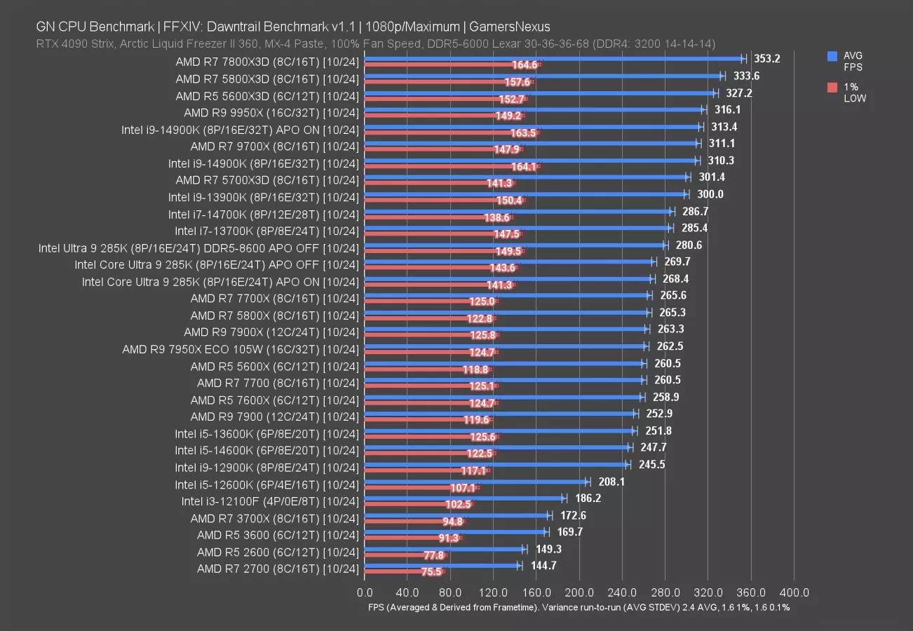 The 5800X3D and 5600X3D are also at the top here, showing that Dawntrail just generally really likes cache, at least on these CPUs. The 5700X3D is a little lower down since its frequency is 300MHz below that of the 5600X3D, so these results make sense.