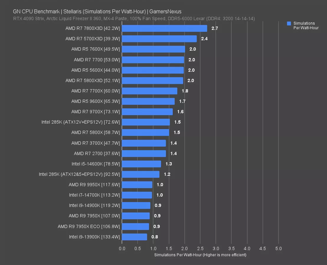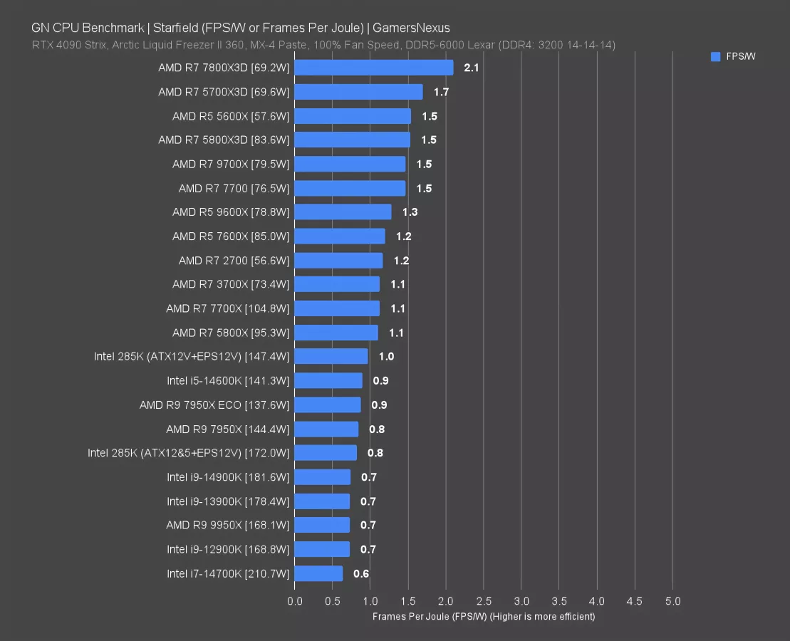 Finally, Final Fantasy 14 for efficiency. In this one, the 7800X3D led with an impressive 42.5W power draw while spewing hundreds of frames per second, allowing it a result of 8.3 FPS/W. That’s great. The 5700X3D keeps its second-place spot at 7.7. The 14900K ran at 3.1 FPS/W, so the 285K is 32% improved by these numbers. This is one where the 285K was regressive in performance against the 14900K -- and by sort of a lot, but we’ll come back to that. The result is reduced efficiency gains.