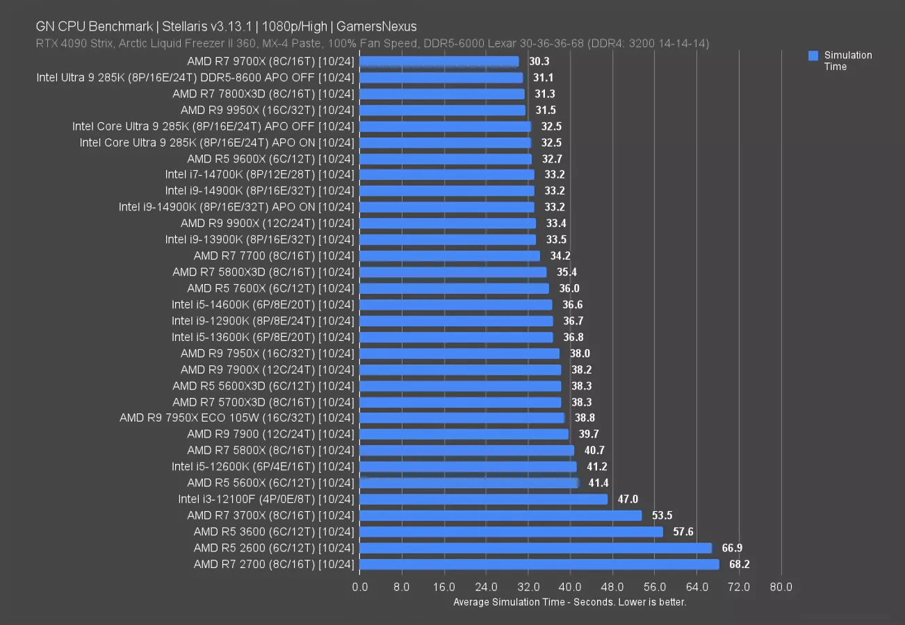 The 285K required 32.5 seconds for the simulation, finally putting it ahead of the 14900K. The 285K requires about 1-2% less time than the 14700K and 14900K CPUs.
