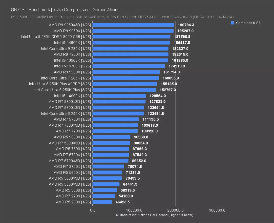 Decompression testing is next. In this test, the 250K Plus completed 146.8K MIPS, which matched it with the 9800X3D. The 8-core X3D CPUs have never been impressive in this test, as most of their benefit is in gaming. Enabling PPP pushed it up to 151K MIPS, an improvement from without PPP of 3.2%.