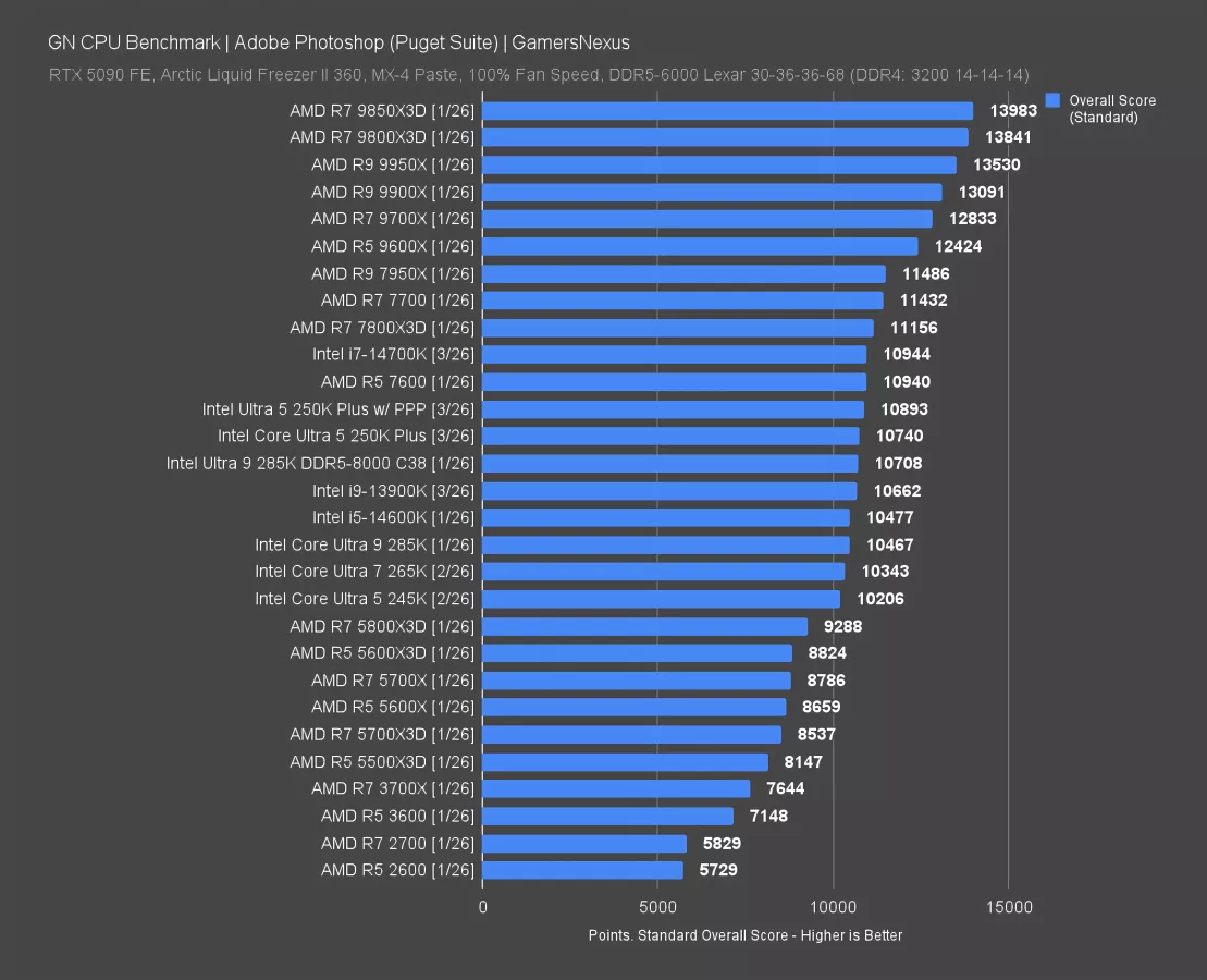 AMD’s top CPUs here are all functionally the same in performance, with no real advantage to the 16-core parts versus some of its better 8-core parts. We don’t have the 14900K retested in this one anytime recently and were too busy benchmarking Crimson Desert to go back for it, but we do have the 14700K. The 14700K has about the same overall score as the 250KP and R5 7600 in this test, which matches the results we had in this test a little over a year ago in terms of relative scaling.