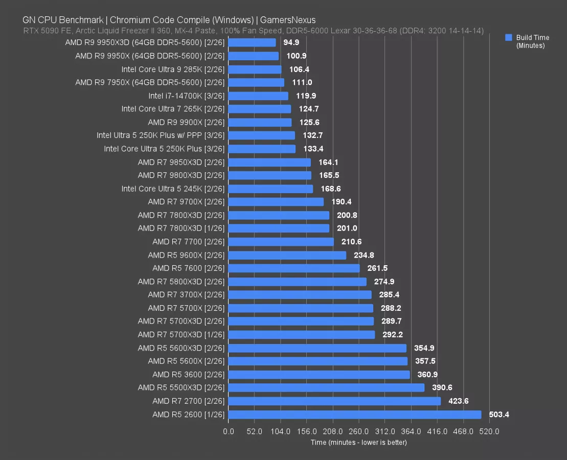 AMD’s gaming-class CPUs haven’t been as competitive in this test as Intel in a while: X3D isn’t really built for this, with the cache helping less than more cores or higher clocks on something like the 9800X3D, which is slower than the 250K Plus.