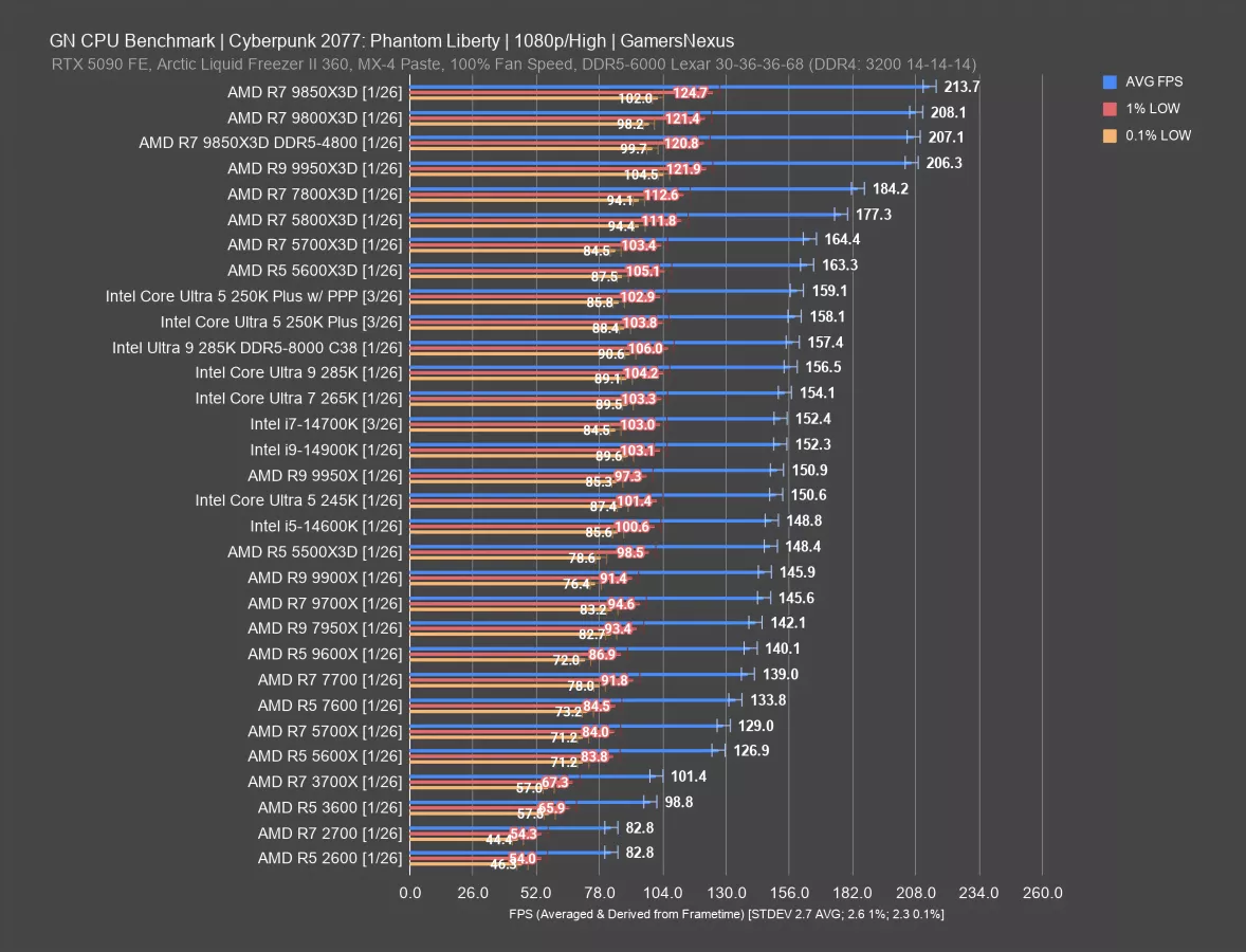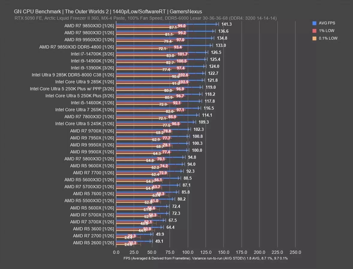 To establish the ceiling, the AMD 9850X3D (read our review) ran at 143 FPS AVG for a 19.6% advantage on the much cheaper 250KP. For a closer price comparison, the 9600X (read our review) at 96 FPS AVG was outmatched by the 250KP by 24%.
