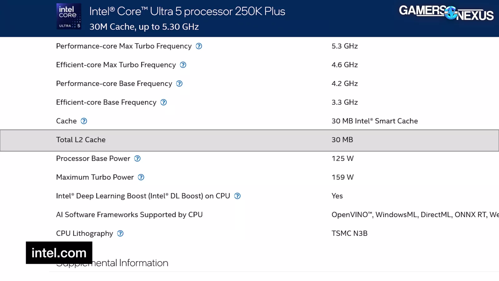This is a reconfiguration of the spec itself, so the 250K Plus is not an exact replacement for the 245K. The core count change means it’s not only a frequency bump. The 245K is on 26 MB of L2. While the 250KP is no X3D, it should still have an outsized impact on performance against the older 245K with its larger cache.