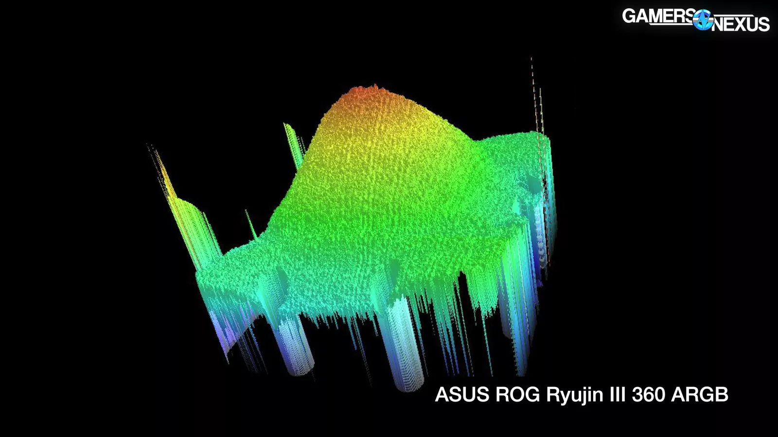 Scaling it 100x, we get this almost comical tower protruding from the coldplate. This helps us see the steep slope as ASUS applies massive pressure dead-center with its coldplate design. This is sort of a hamfisted approach and version of what Noctua did more precisely with the D15 G2 for LGA 1700, except Noctua had more nuance in the exact shape of the convexity, which will better align with the concavity in LGA 1700 CPU heat spreaders previously. It’s similar to what we saw in the $60 Thermalright liquid cooler, which managed to brute force its way in performance thanks to similar protrusions.