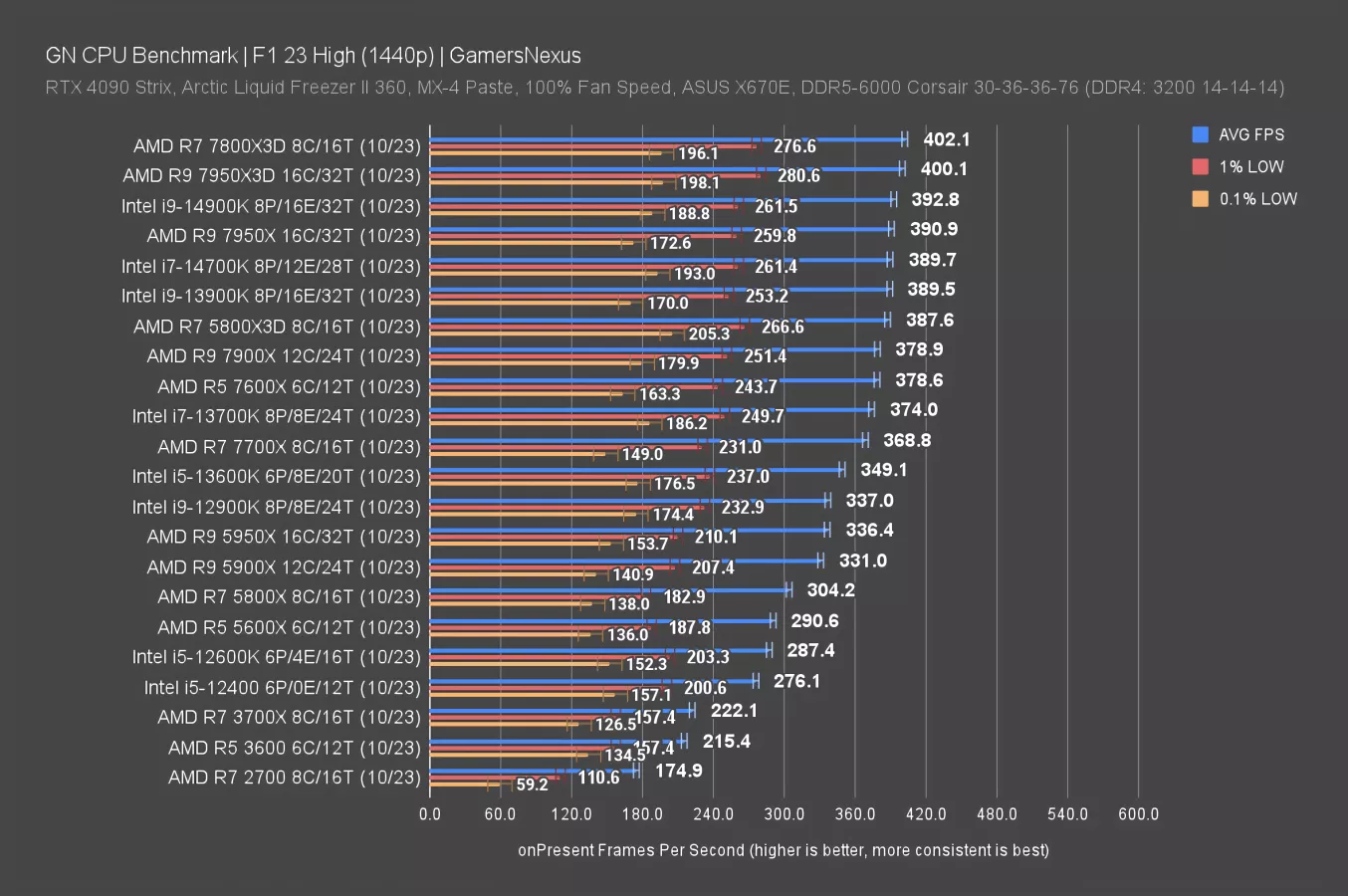 But, to be fair, this is a title where you’d want to favor Intel if you expect to be CPU-bound. The lead is a meaningful 23% over the 7800X3D for the 14900K.