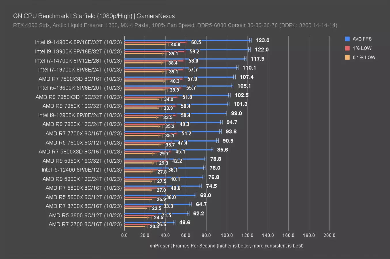 Starfield is another one that shows scaling for Intel -- sort of. Or at least, Intel has managed to wedge itself at the top of the chart to supplant the pesky X3D CPUs.