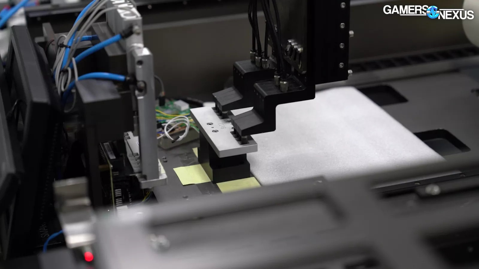 In this shot, we can see the memory chips themselves getting placed on the PCB by the robotic arm, before and after each movement it’s optically scanning to ensure accurate placement prior to baking.