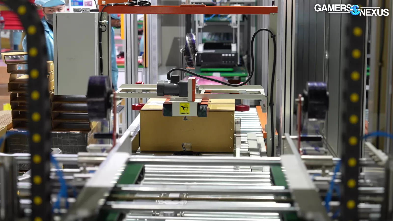 Despite being maybe one of the least sophisticated parts of this factory, the automation around a roll of tape is surprisingly satisfying: Each box gets auto-taped, rotated, and taped again, and although we couldn’t name any of the clients earlier, there might be hints in the image above as to who some of them are. But we’re not sure...