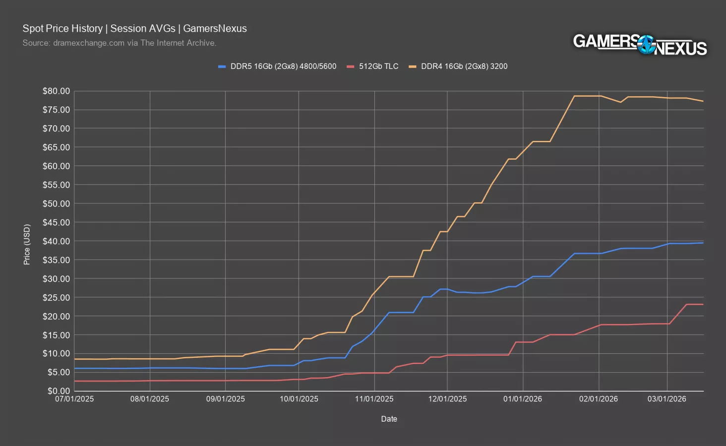 This chart plots spot price session AVGs from July 2025 to March 2026 for DDR5 16Gb, 512Gb TLC, and DDR4 16Gb. We collected this data using the Internet Archive to compile a brief spot price history as updated on dramexchange.com. These are supply costs. Contract prices are often different, but spot prices give us an idea for upstream supply chain pricing.