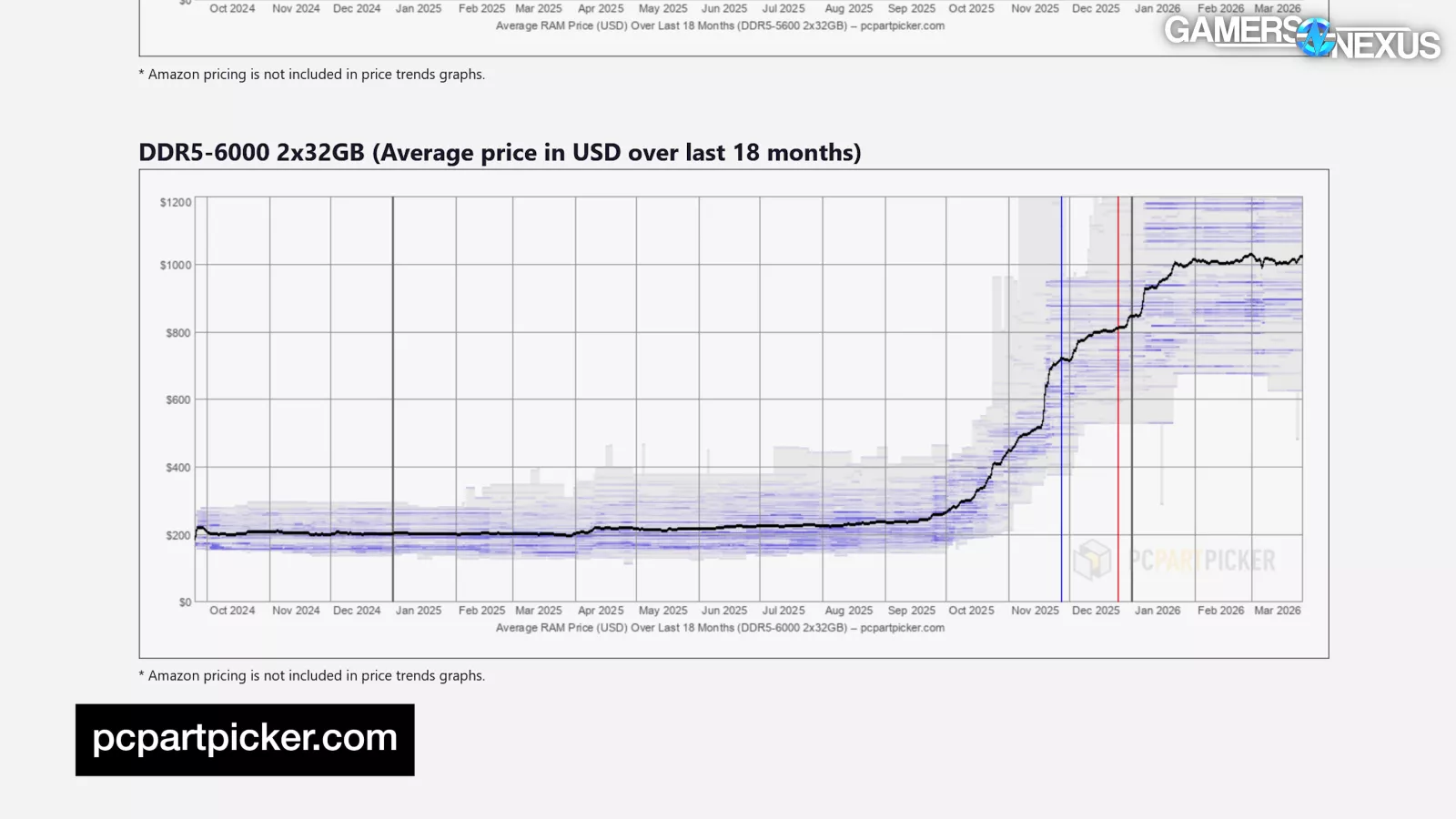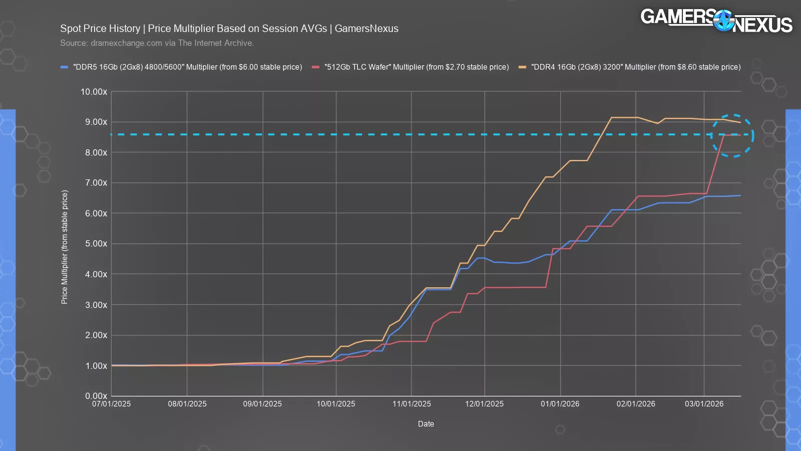 DDR5 16Gb’s session AVG at slower speeds surpassed its previously stable price by 2x just before November, exceeded both 3x and then 4x in November (which is when we made our RAM: WTF? video), and shot 5x and 6x past its previously stable price in January, gradually increasing since. It currently is approaching a 7x multiplier.