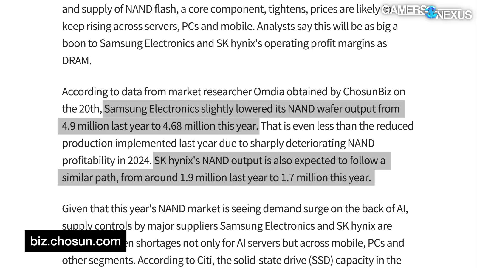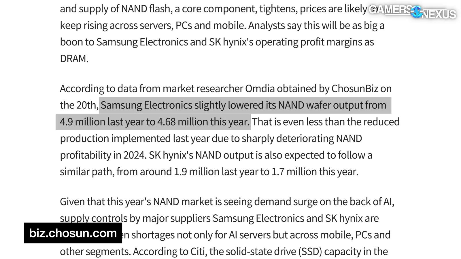 ChosunBiz, citing Omdia, reports: “Samsung Electronics slightly lowered its NAND wafer output from 4.9 million last year to 4.68 million this year. [...] SK hynix's NAND output is also expected to follow a similar path, from around 1.9 million last year to 1.7 million this year.”