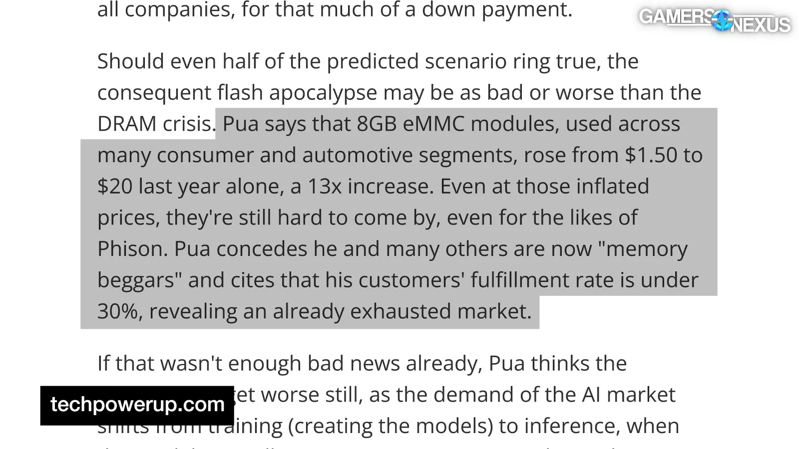 Phison, a NAND controller manufacturer, has reportedly begun requesting prepayments on orders. The CEO claims that 8GB eMMC, or embedded multi-media card, modules “rose from $1.50 to $20 last year alone,” and notes an under 30% fulfillment rate, as reported by Tom’s Hardware.