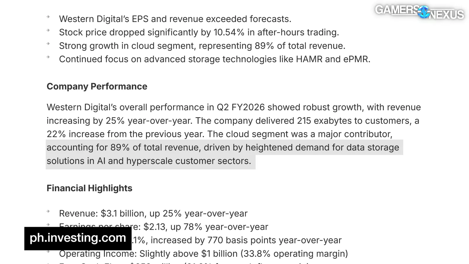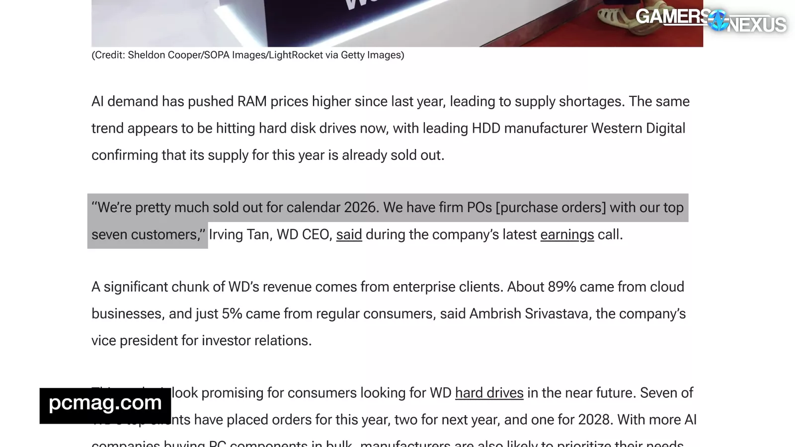 This PC Mag writeup from February notes that AI data centers reserved all of Western Digital’s 2026 supply, quoting Western Digital’s CEO as saying: “We’re pretty much sold out for Calendar 2026. We have firm POs with our top seven customers.” PC Mag noted 89% of WD’s revenue comes from enterprise and cloud service solutions, which would include data centers.