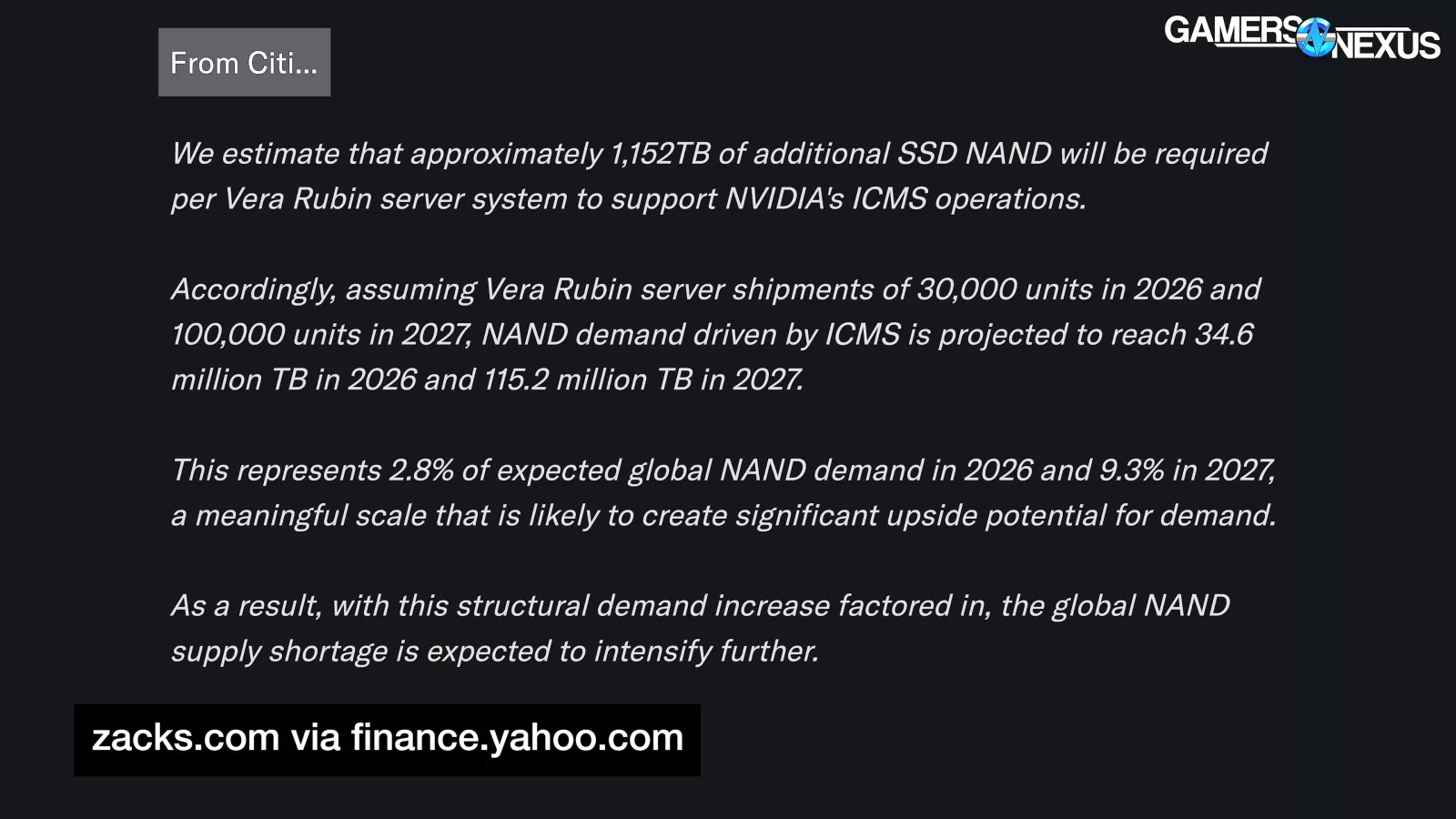 Reported via Yahoo Finance, Citi estimates that “NAND demand driven by ICMS,” or NVIDIA’s Inference Context Memory Storage platform, is projected to represent “2.8% of expected global NAND demand in 2026 and 9.3% in 2027,” meaning that NVIDIA will more than triple the storage needs of this specific solution against global NAND demand.