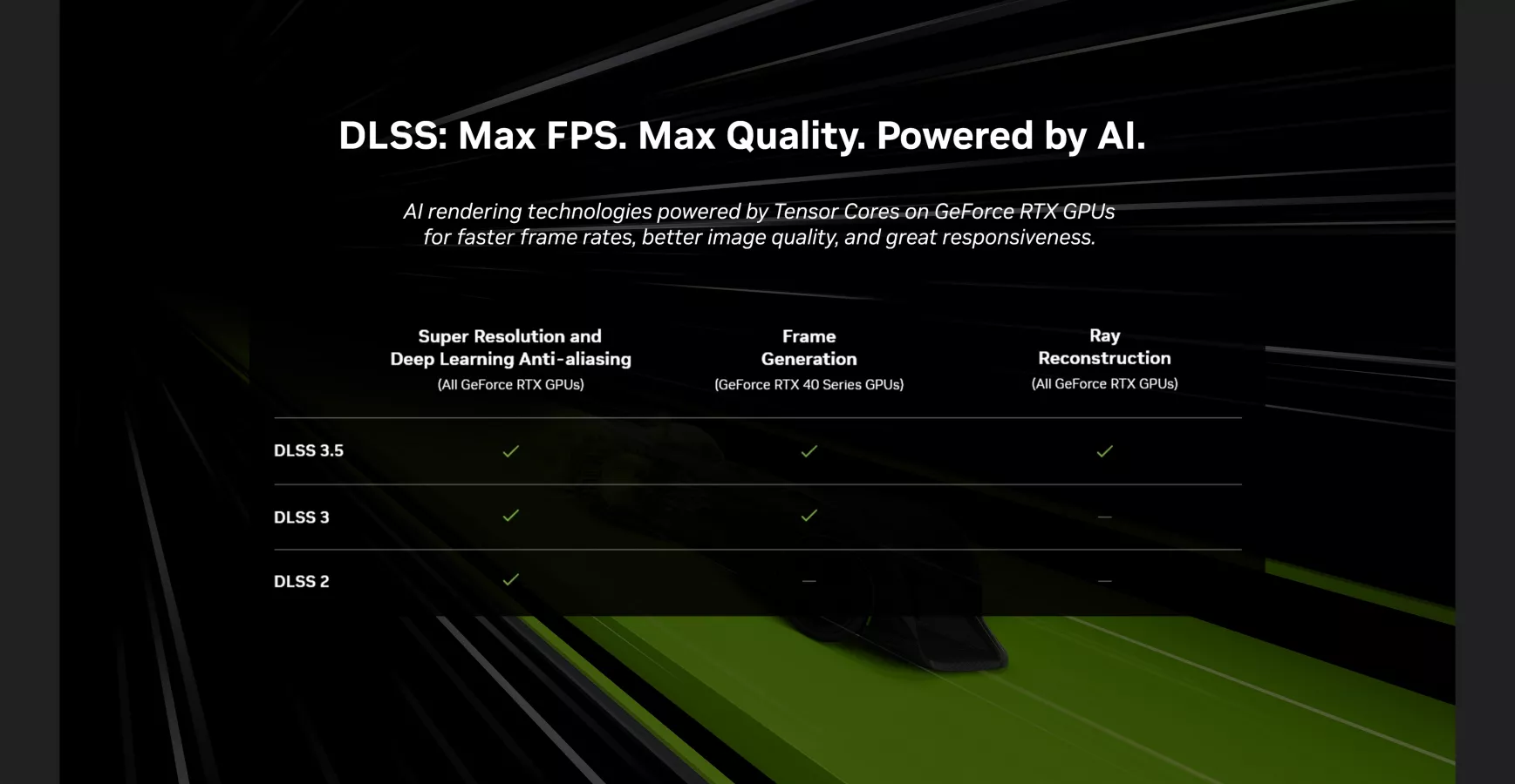 | Path Tracing (Ray Tracing) | DLSS Frame Generation | DLSS Upscaling | Ray Reconstruction | |