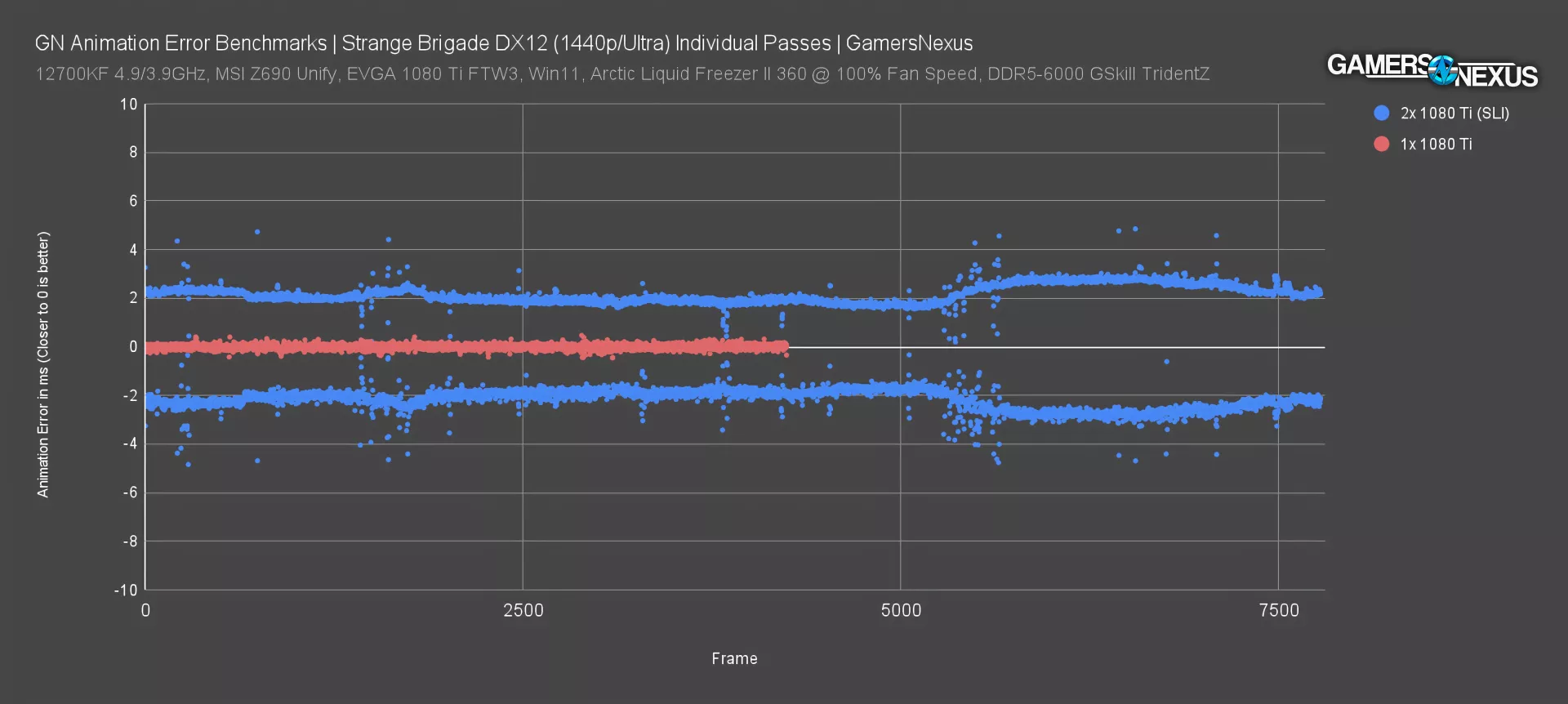 SLI outperforms the single-card so heavily in this title that the red line is significantly shorter, which is a downside of using frames as an X-axis. Even though both its average framerate and its 1% and 0.1% lows are overall good here, the animation error is far superior on the single GPU. There is a possibility that it feels better to a player, but not for the reasons everyone in this community has said for years: It’s not due to frametimes, on a technicality, but animation error, which is a metric that has been under the surface this whole time.