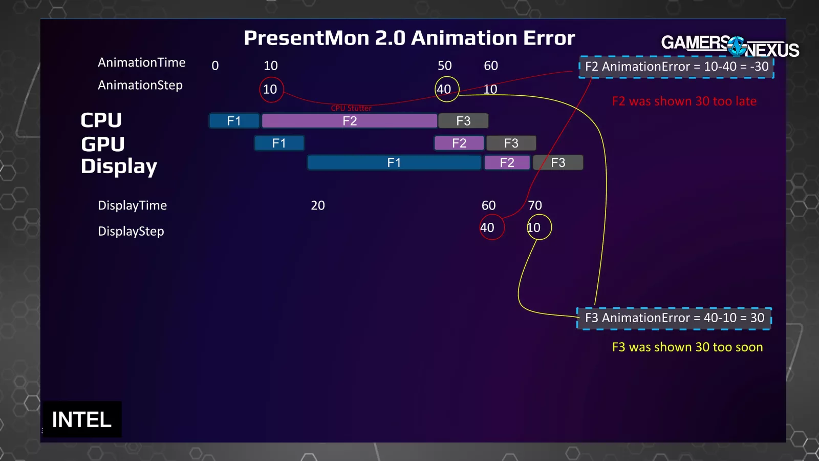 In this mockup from Intel, the bar marked "CPU Stutter" marks a frametime spike, while the mismatch between the sizes of the bars in the top and bottom rows is the animation error (F1 versus F1 = error for F2, F2 versus F2 = error for F3), so we'd see similar spikes in both metrics.