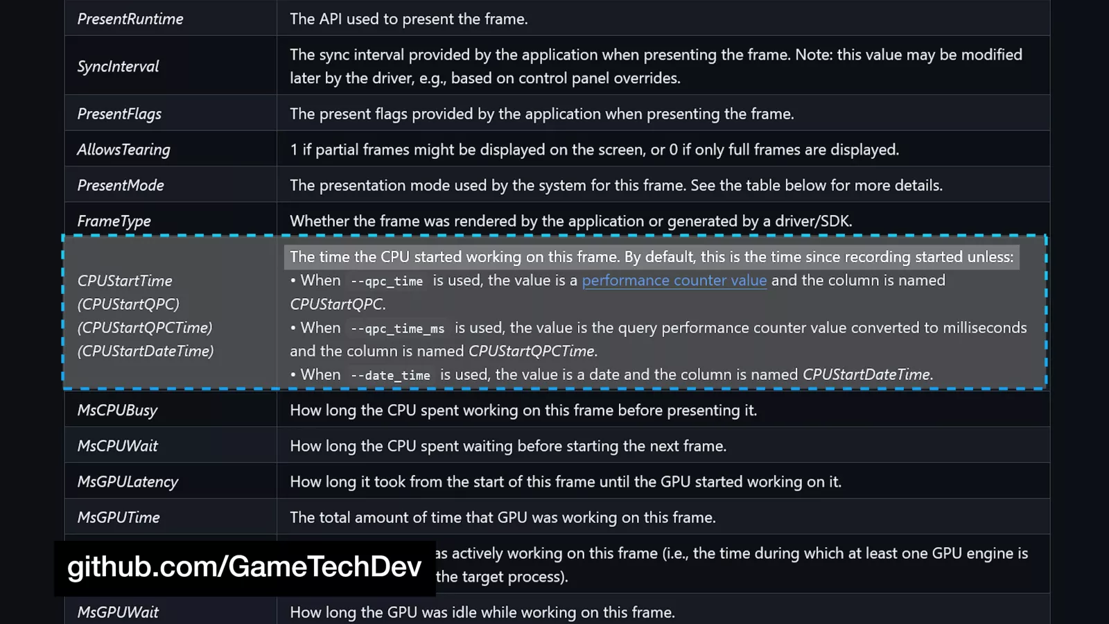 TimeInMs: This is the timestamp of the Present() call we just mentioned. It's important to remember that this call doesn't mark the beginning of the GPU rendering step, because the GPU can get a head start before the CPU is done generating API calls.