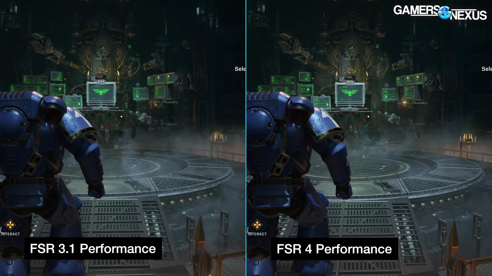 We’ll start the comparisons with a scene in the Armory, or “Armouring Hall” in native Grimdark. Even before walking forward, the difference between FSR 3.1 and FSR 4 is stark. Static elements like the floor of the walkway that shift and shimmer heavily with FSR 3.1 are now stably locked-in. On top of that, the entire image is much clearer and more detailed.