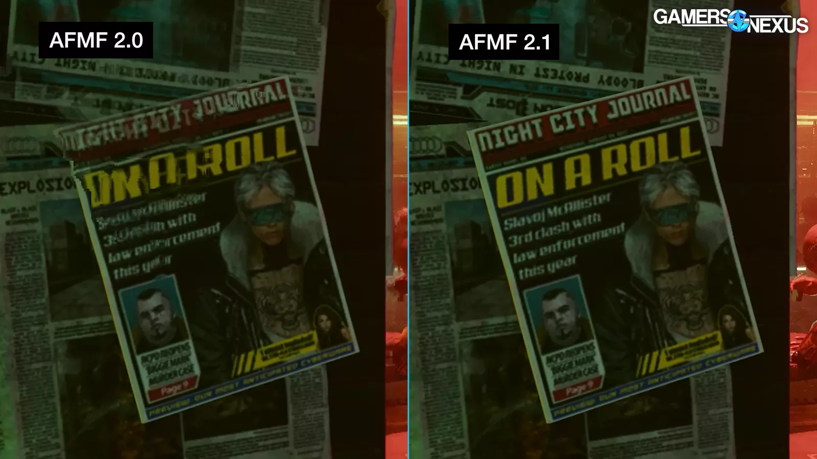 As the camera passes the corner with pages from the Night City Journal, 2.1 does a much better job of preserving text and fine detail where 2.0 just ghosts.