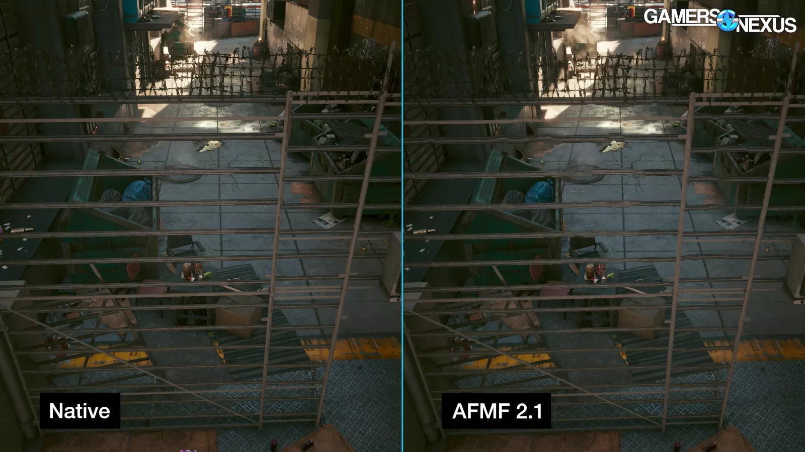 Again, we can check back against the native footage for confirmation that the behavior we're seeing comes from AFMF. The horizontal fence bars are straight and uninterrupted in each frame of the native capture, whereas they're frequently broken up and uneven in the AFMF 2.1 footage, although AFMF 2.1 does do a fairly good job of preserving the scene behind the fence without major framegen distortion.