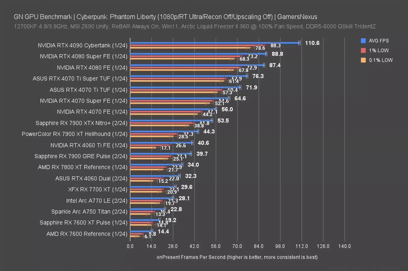 At 1080p/Medium RT, the 7900 GRE runs at about 57 FPS AVG, giving the 7900 XT a 14% lead and leading the 7800 XT 13%. NVIDIA is where it gets interesting: The 4070 Super now leads the 7900 GRE by a more remarkable 34%. If you really care about super heavy ray tracing, especially in Cyberpunk or games like Dying Light, then NVIDIA still maintains the advantage. But in lighter RT games coming up, it evens out. Just depends on the load.