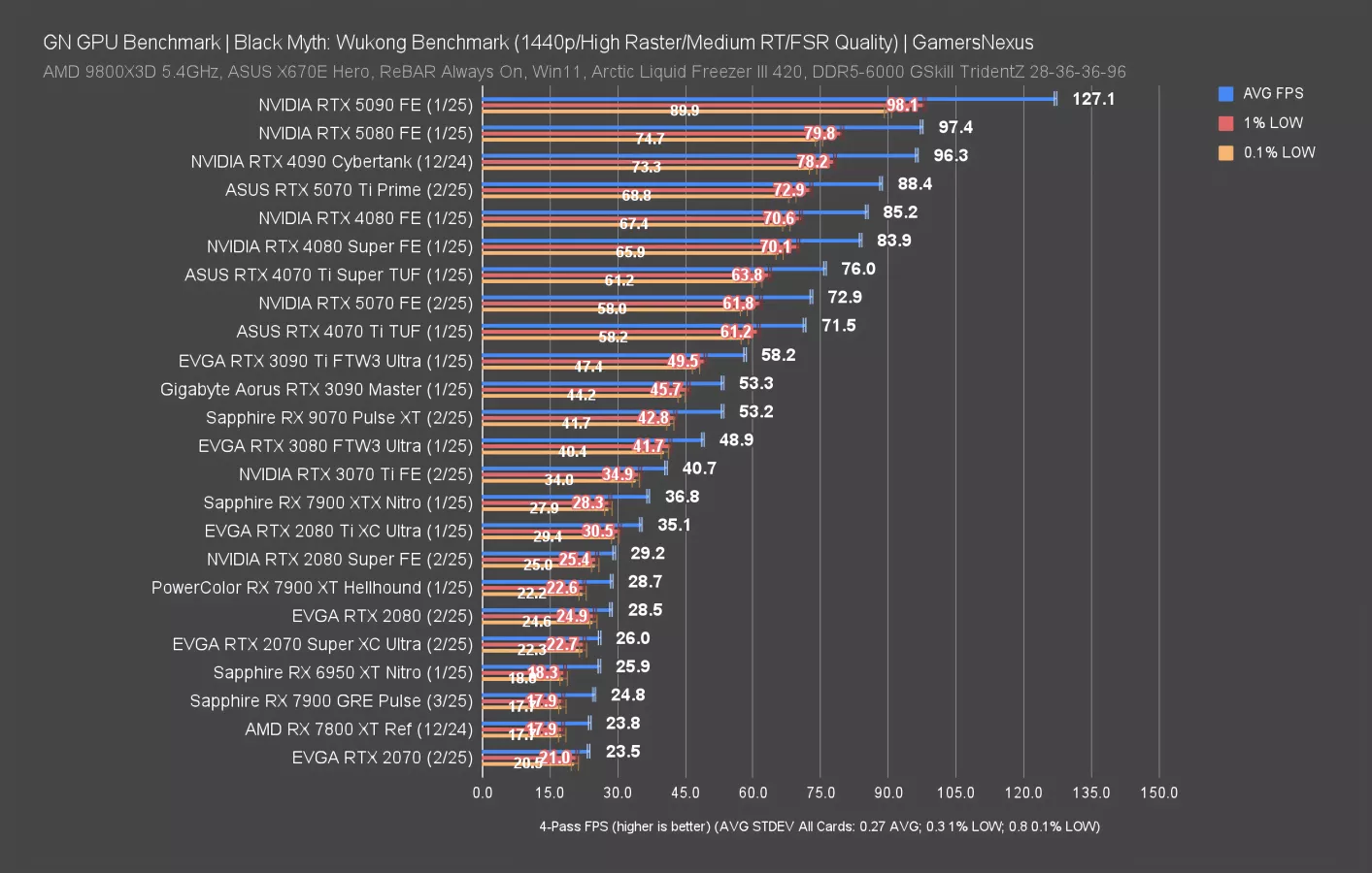 At 1440p, the 9070 XT ran at 89 FPS AVG and tied the 4070 Ti Super and 3090 Ti. It’s marginally ahead of the 7900 XTX, though they’re functionally equal. The RTX 5070 Ti leads the 9070 XT by 16% now, down from 24% at the higher resolution. The 4080 Super and FE were tied with each other and aren’t distant from the 5070 Ti.