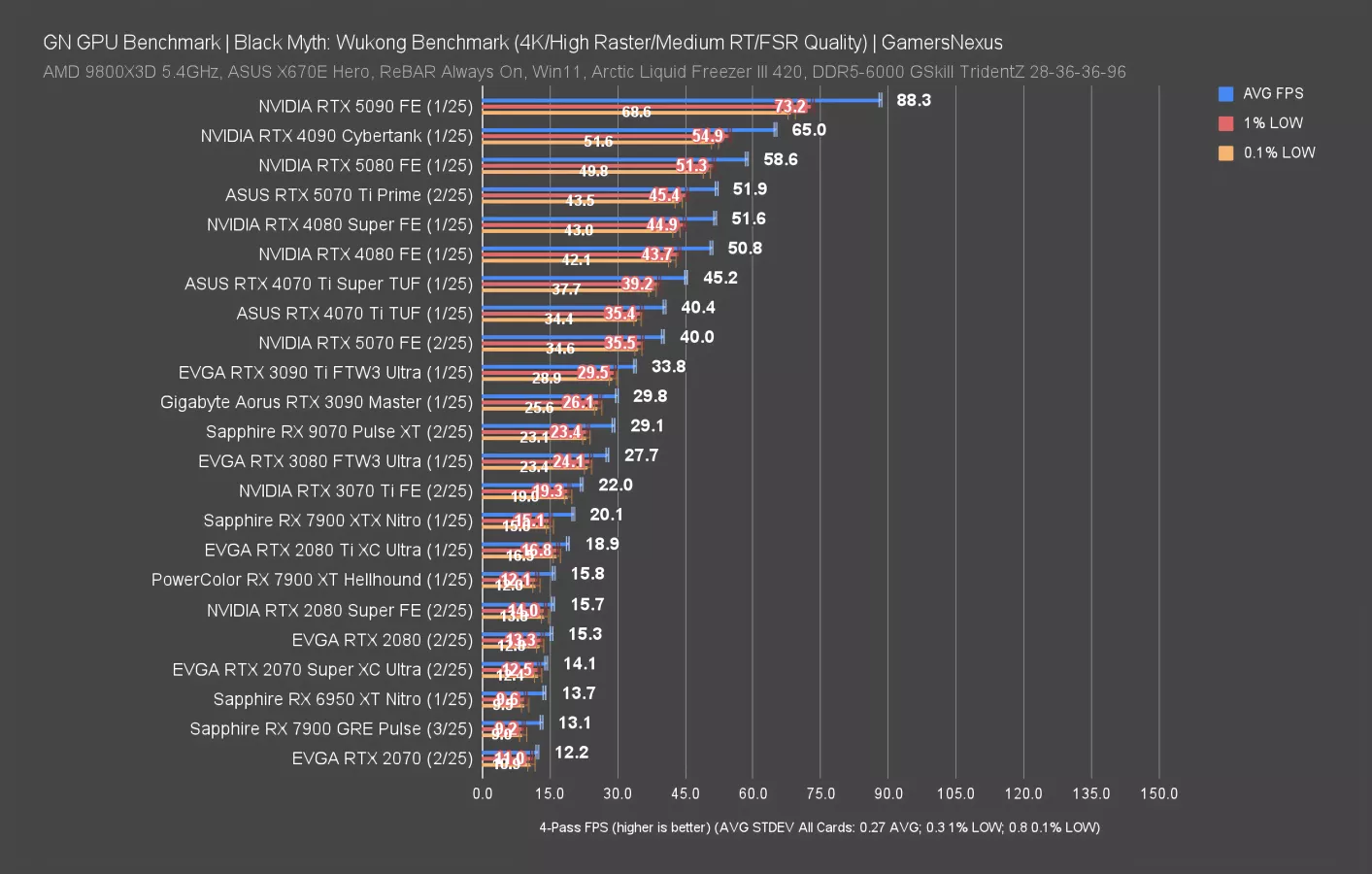 At 4K, the 9070 XT ran at 62 FPS AVG, which has it just ahead of the 3090 Ti. It’s also 11% ahead of the 5070. The 5070 Ti leads the 9070 XT by 12% in this test, which matches its gain in other tests where it held an advantage.