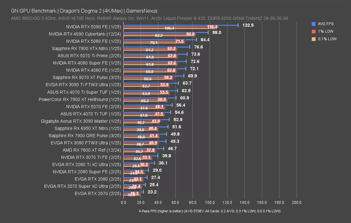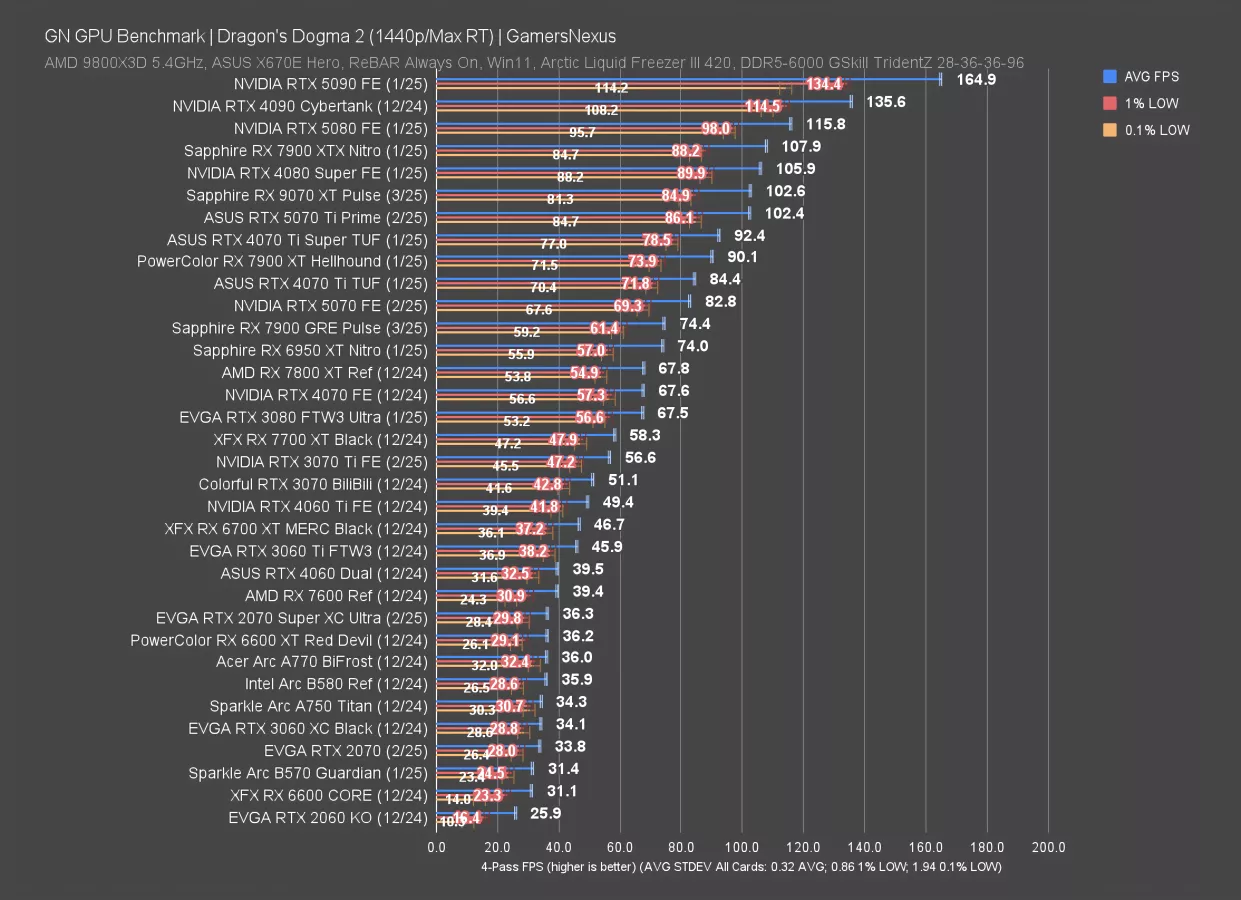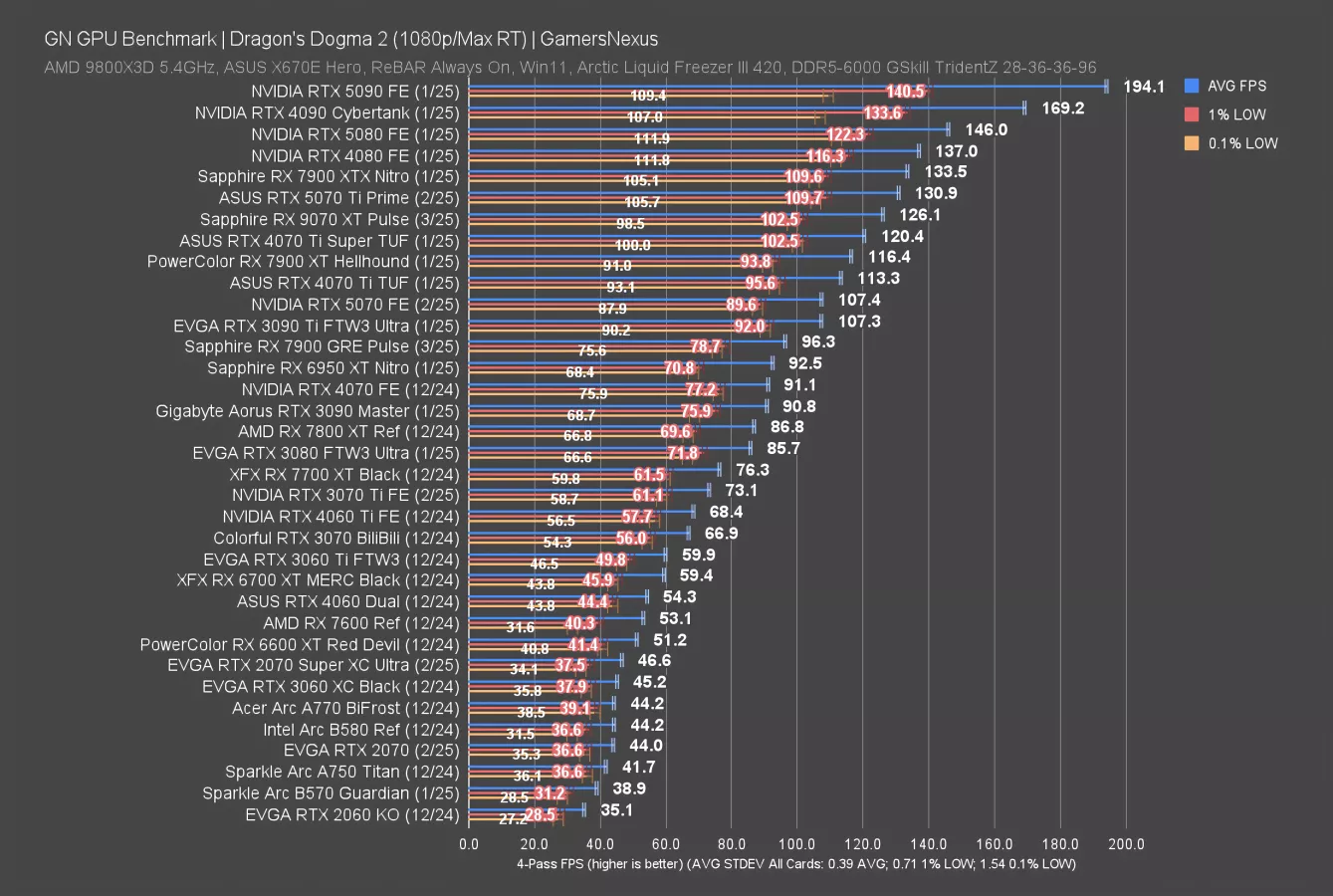 Dragon’s Dogma 2 at 4K is a remarkably strong showing for the RX 9070 XT. In this benchmark, the 9070 XT ran at 70 FPS AVG, landing it between the RTX 4080 (read our review) and RTX 3090 Ti. That means that even taking MSRP at face value for both cards, the $600 9070 XT is achieving 95% of the performance of the $750 RTX 5070 Ti Prime, but at 80% of its MSRP. We want to caution that this result doesn’t always happen -- sometimes a 9070 XT is worse than a 5070, so it depends on the game. But this is a great start.