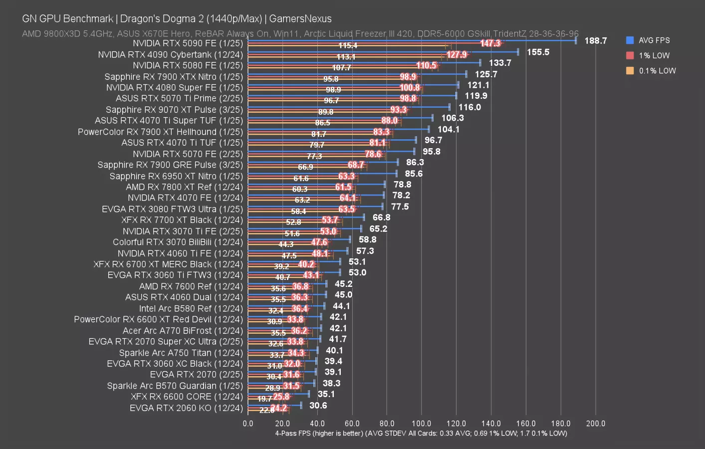 In Dragon’s Dogma 2 with ray tracing and at 4K, the RX 9070 XT ran at 61 FPS AVG. This has it ahead of the RTX 5070’s 49 FPS result by 26%. The 5070 Ti leads the 9070 XT marginally and by 2 FPS, or 3.6%. The 7900 XTX is about 5 FPS ahead of the 9070 XT.