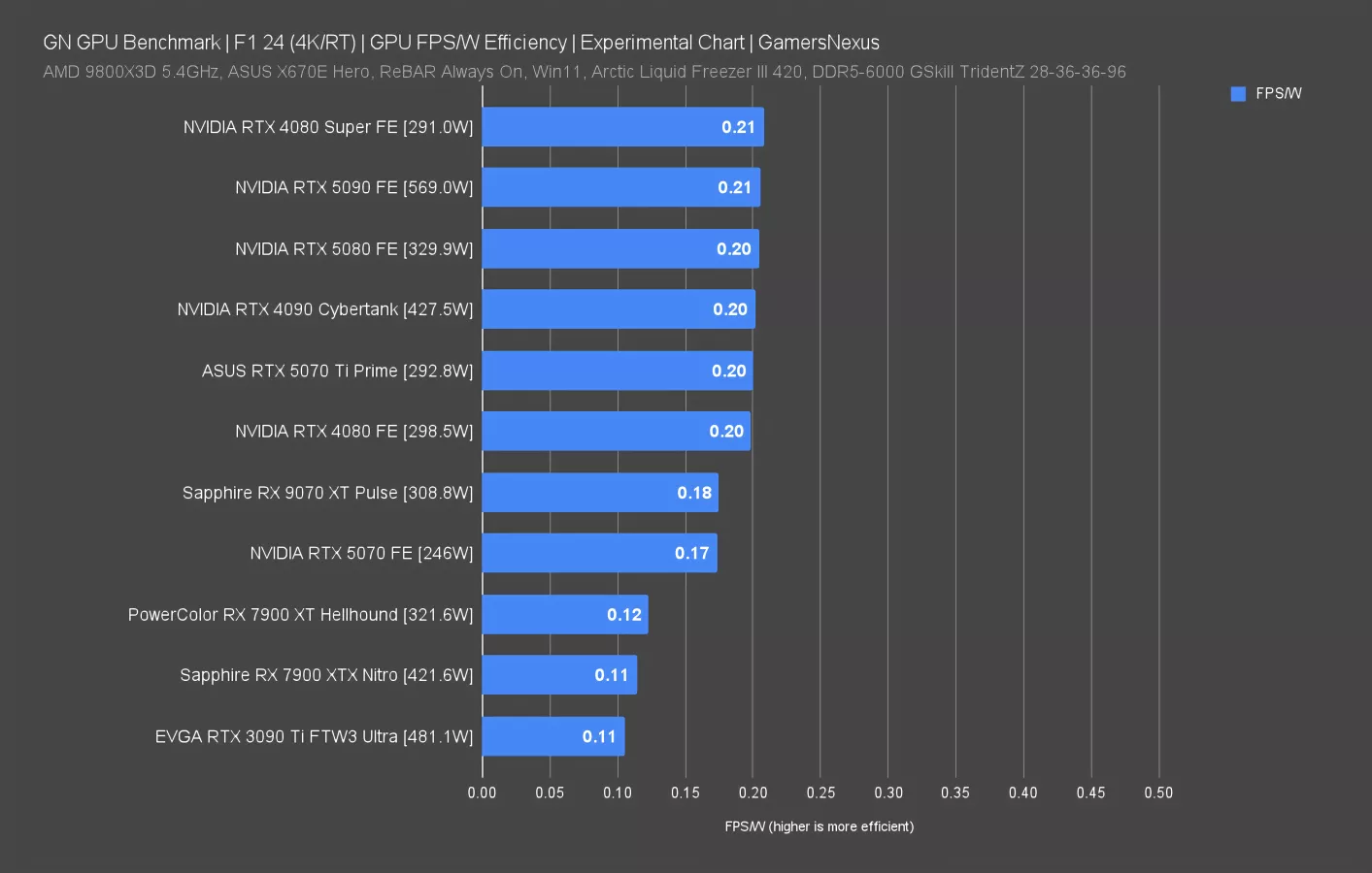 Here’s a better test for the 9070 XT. In F1 24 at 4K and with ray tracing, the 9070 XT ran at 0.18 FPS/W. These results round to the second place, so differing bar sizes for the same numbers is normal -- it just means the hidden digits are separating them.