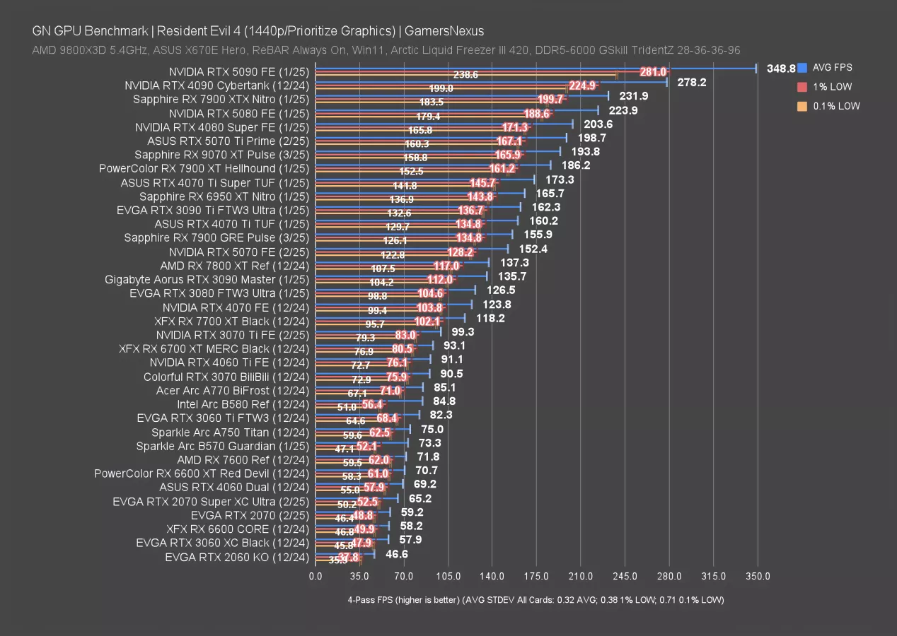 Resident Evil 4 swings it back the other way: At 4K, the RX 9070 XT now holds a 103 FPS AVG, landing it nearly tied with the RTX 4080 Super. That’s a great spot for AMD’s card, which it needs after that Final Fantasy showing we just saw.