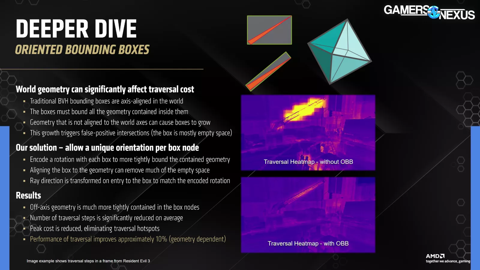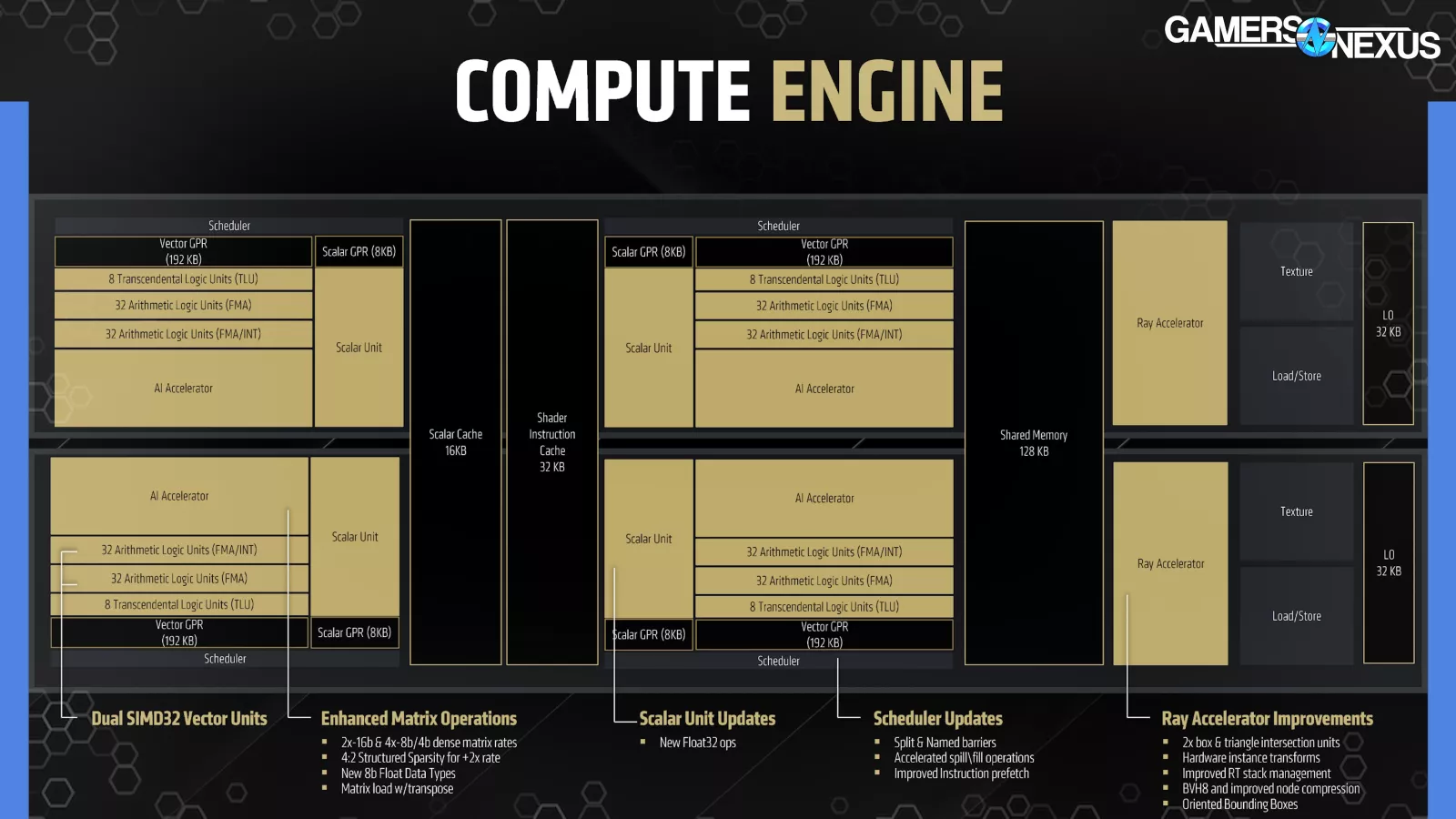 The architecture’s biggest overhaul that we’re aware of has been in ray tracing. AMD has doubled the ray intersection rate, moved to two RT accelerator blocks with a shared 128KB memory, moved to BVH8, and introduced oriented bounding boxes to reduce or eliminate false positives in ray-triangle and ray-box intersections. AMD also introduced a dedicated ray transform block to help with transformation. This is all stuff that AMD needs to improve upon because NVIDIA has successfully sort of manufactured a category it’s really good at, which is real-time ray tracing.
